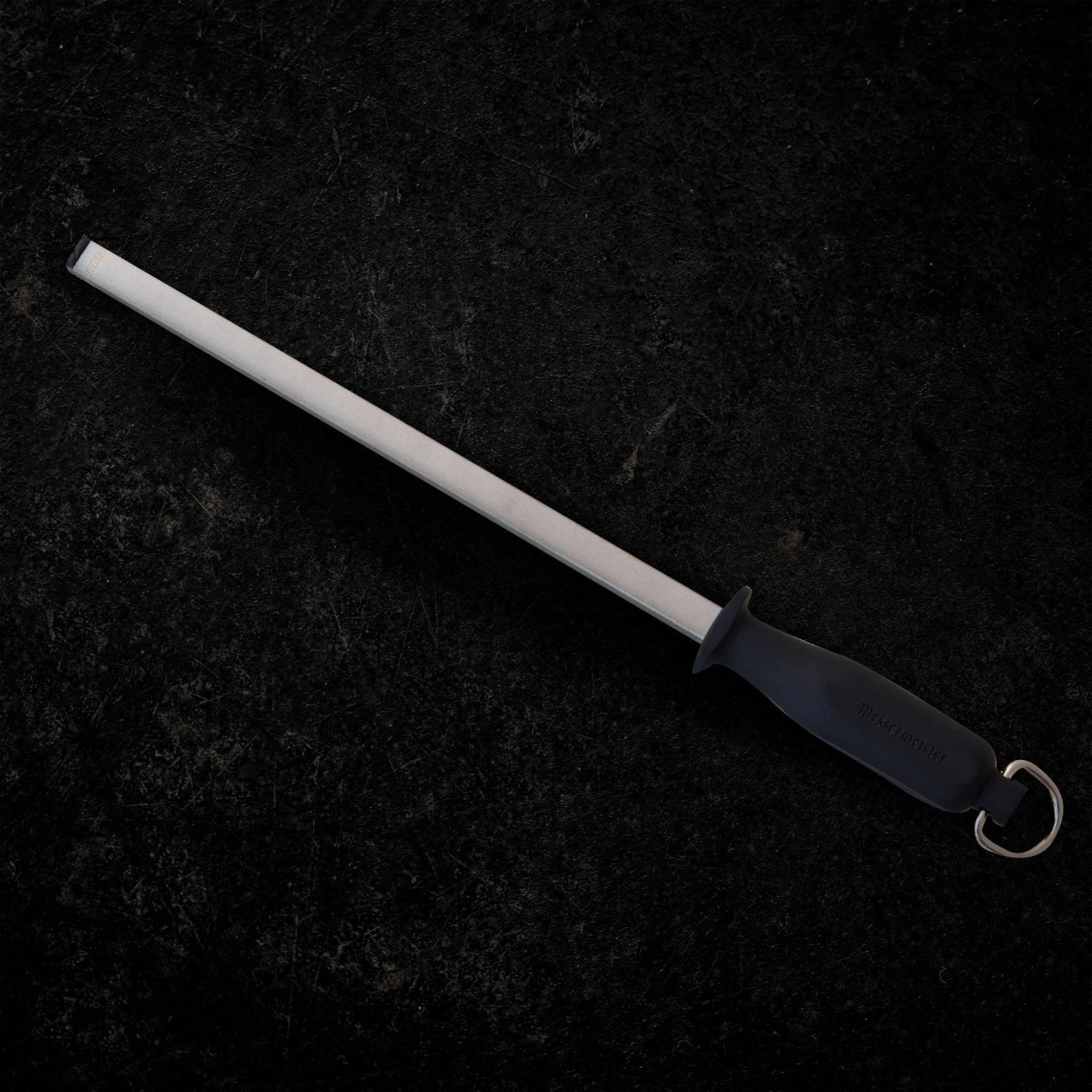 The Messermeister 4-Sided Diamond Sharpening Rod has variable grit surfaces ideal for multi-stage sharpening of knives, scissors and other cutting tools. The 12″ rod has wide flat sharpening surfaces ranging from coarse 200 grit to fine 1000 grit for versatile edge maintenance, and an ergonomic handle with a hang ring. Hand wash with soap and water.