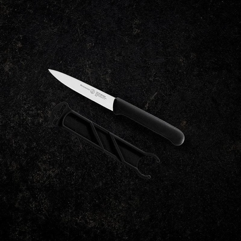 The Messermeister 4″ Spear Point Parer with a traditional straight shaped blade can be used for a variety of small culinary tasks. The Spear Point Parer includes a matching black plastic sheath for on-the-go protection.
