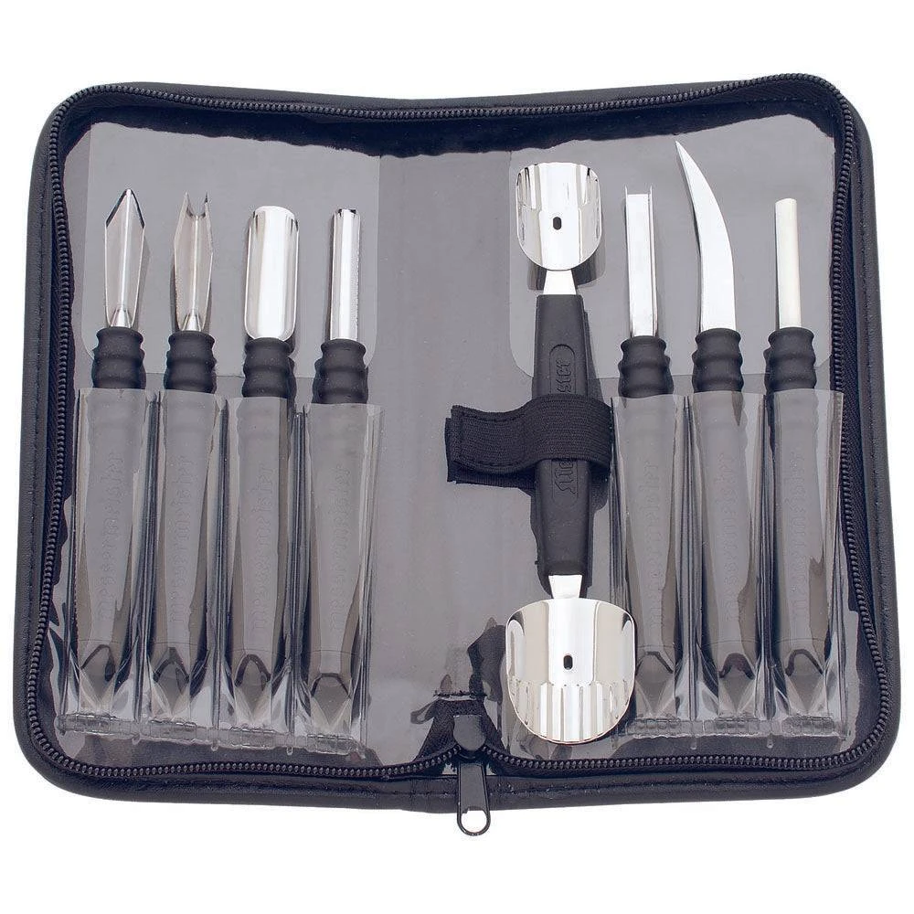 The Messermeister Professional Carving Set is a must have, whether you are a trained chef or an adventurous domestic party planner. This set is comprised of the most often used fruit & vegetable, garnishing & decorating tools as selected by a professional chef/instructor. The stainless steel tool heads are ground to a razor like sharpness and the silicone handles are the perfect size for gaining the best carving grip. The tools are secured in a zippered vinyl pouch which provides safe storage as well as a convenient way to transport them to the carving venue. For those who need a primer on the uses of the various tool heads, weve included a card with descriptions. The tool head edges can be maintained by using the small ceramic sharpening stick which is included with each kit. Each kit is guaranteed to your satisfaction!