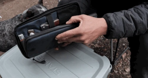 - 2 Pockets for the Chef’s Knife and Fillet Knife, an elastic band and pocket for the cutting board, and 2 elastic bands to hold the Peeler & Parer and Camp Utensil.