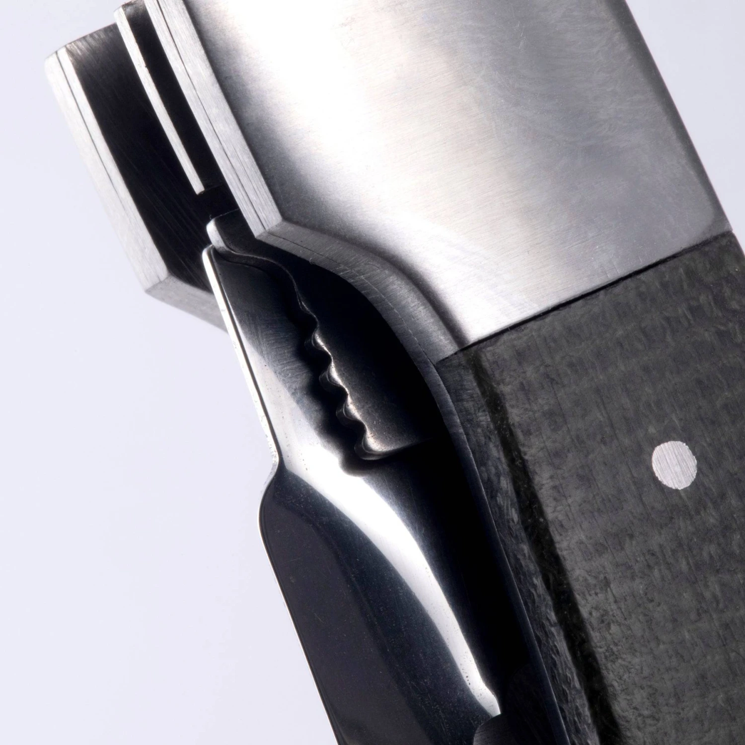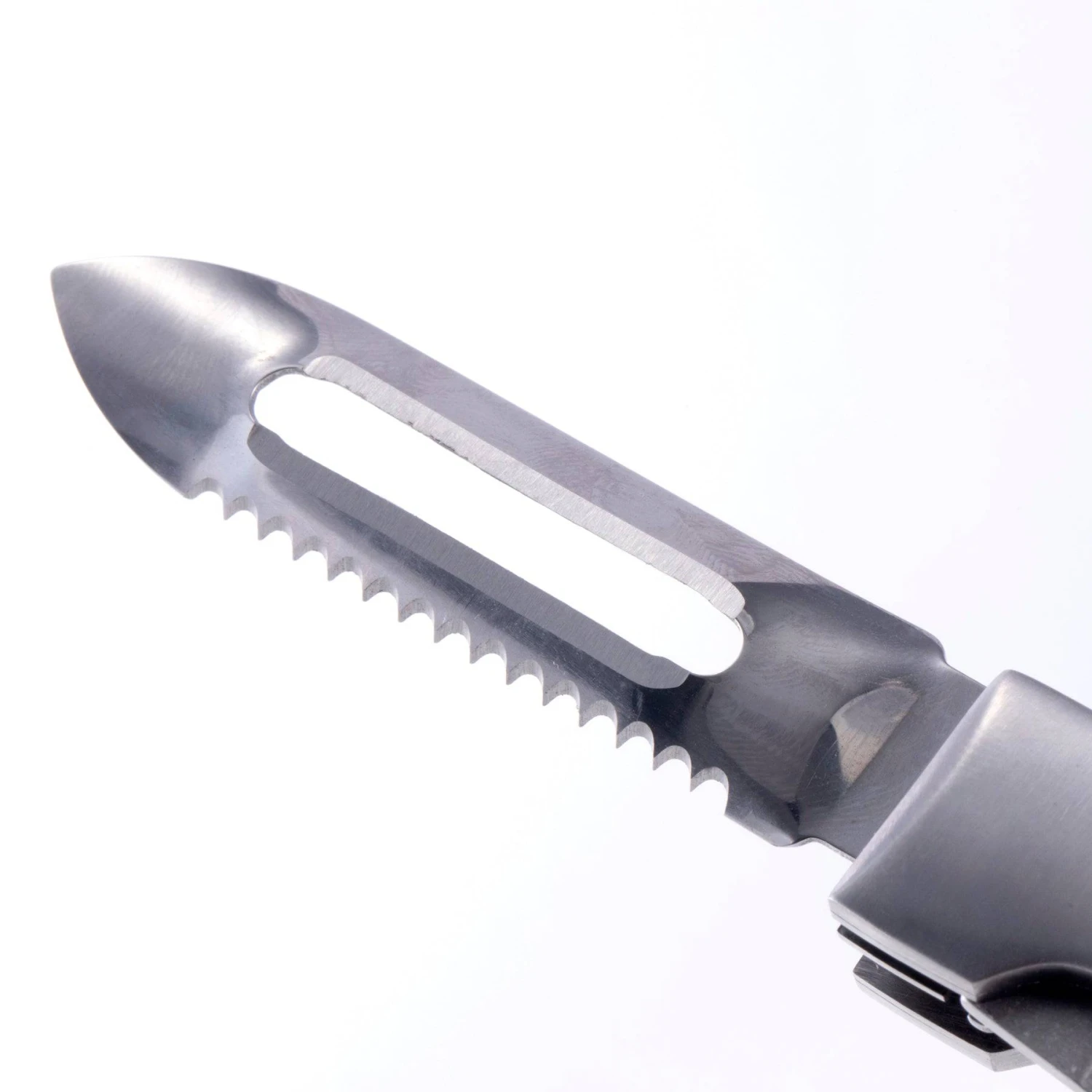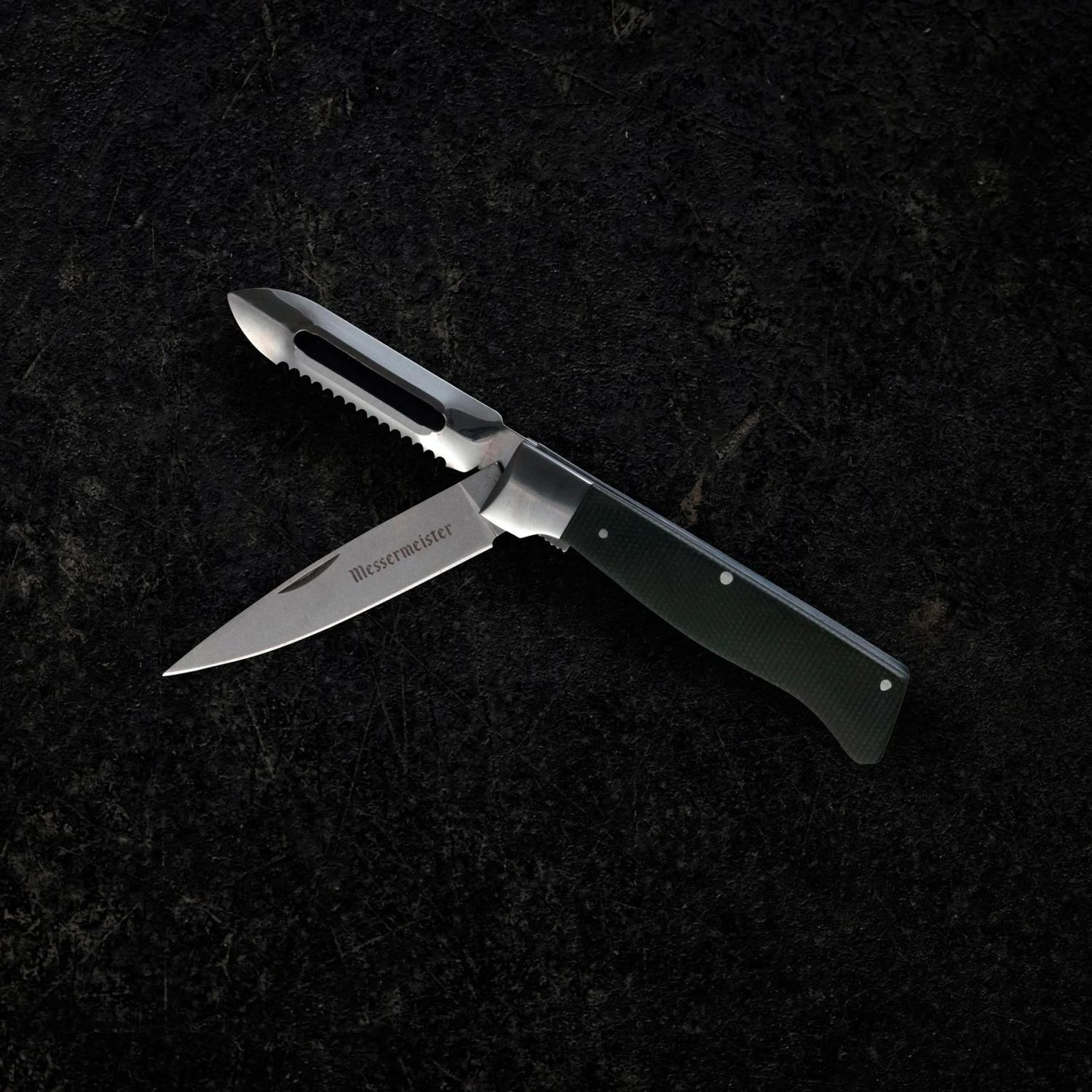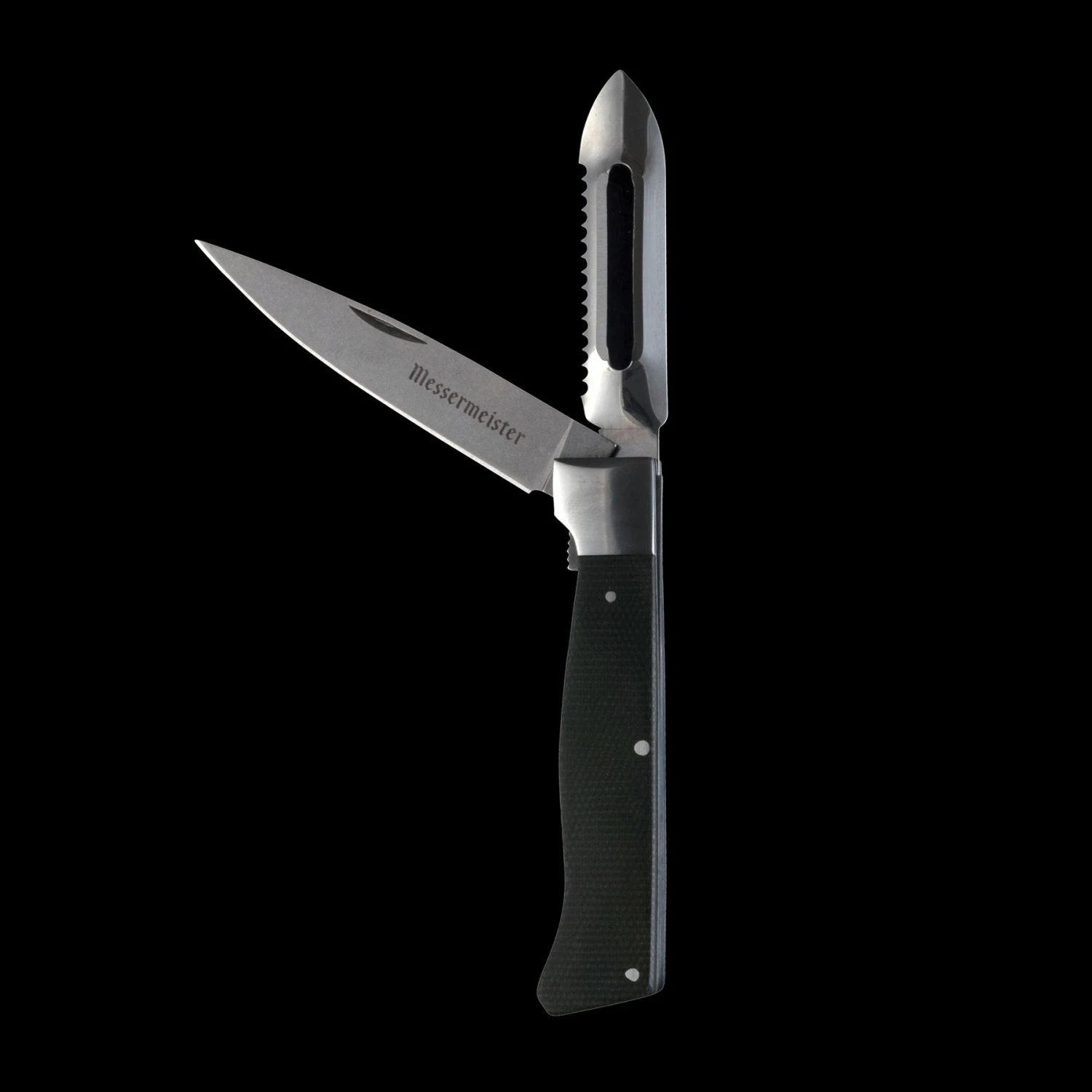 For small tasks, we combined a paring knife with a peeler and even snuck in a fish scaler. It’s the perfect prep tool for the camp kitchen or RV. The drop point paring blade is 3.5 inches long. The blade is held in place when open by a standard non-locking slip joint mechanism. The double-action peeler locks in place when open so it can be used either right or left-handed.