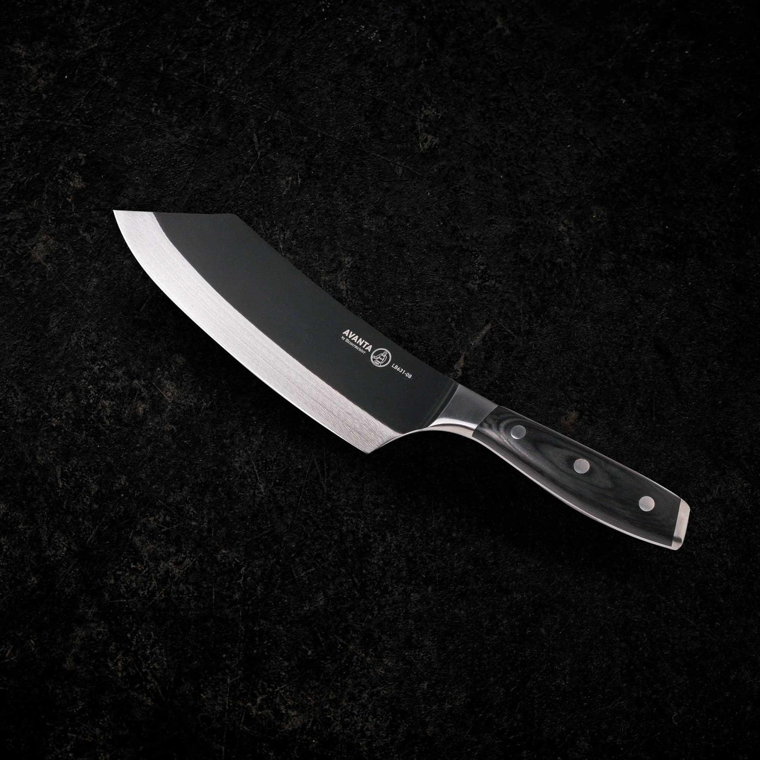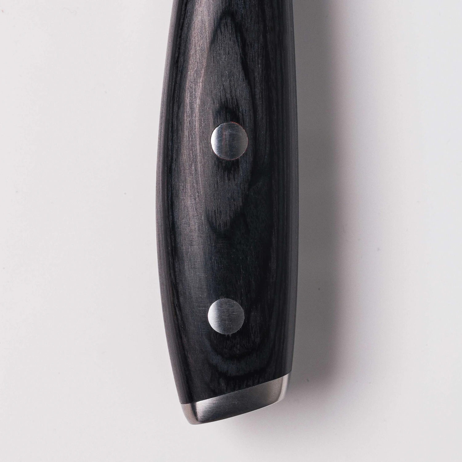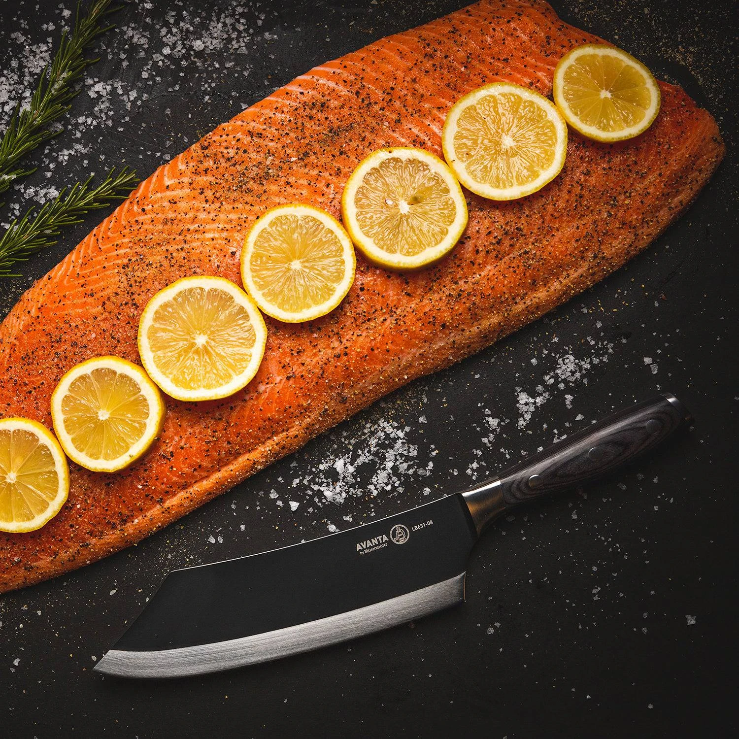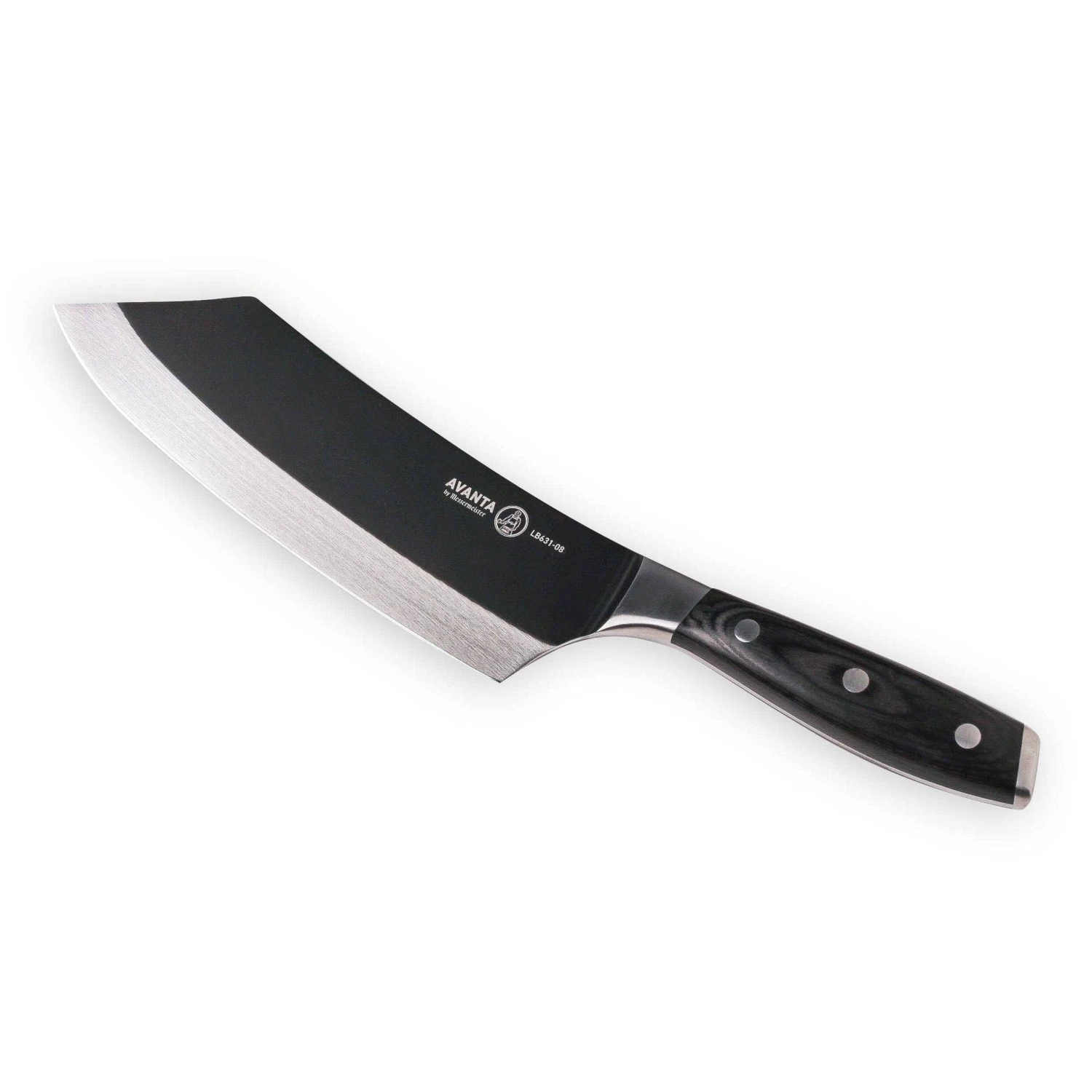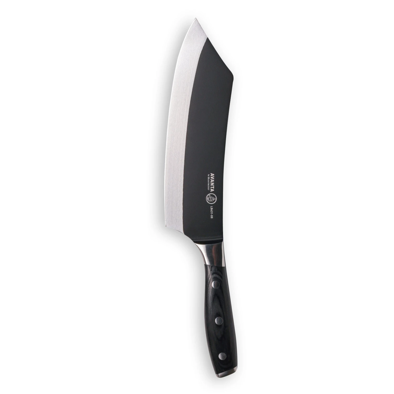 Cook like a boss. Our 8 inch BBQ knife was designed in collaboration with barbecue great, Bennie Kendrick. The knife has a deep rocker for effortless prep work on the cutting board. The butcher’s style blade is ideal for cleaving and trimming meats. The 80/20 blade grind is finished with a razor sharp hollow ground edge. Designed with uncompromising attention to details, our high quality blades are crafted from German X50 stainless steel for knives that are rust resistant and easy to maintain. Solid bolsters and full tang construction give the knives great balance and heft.