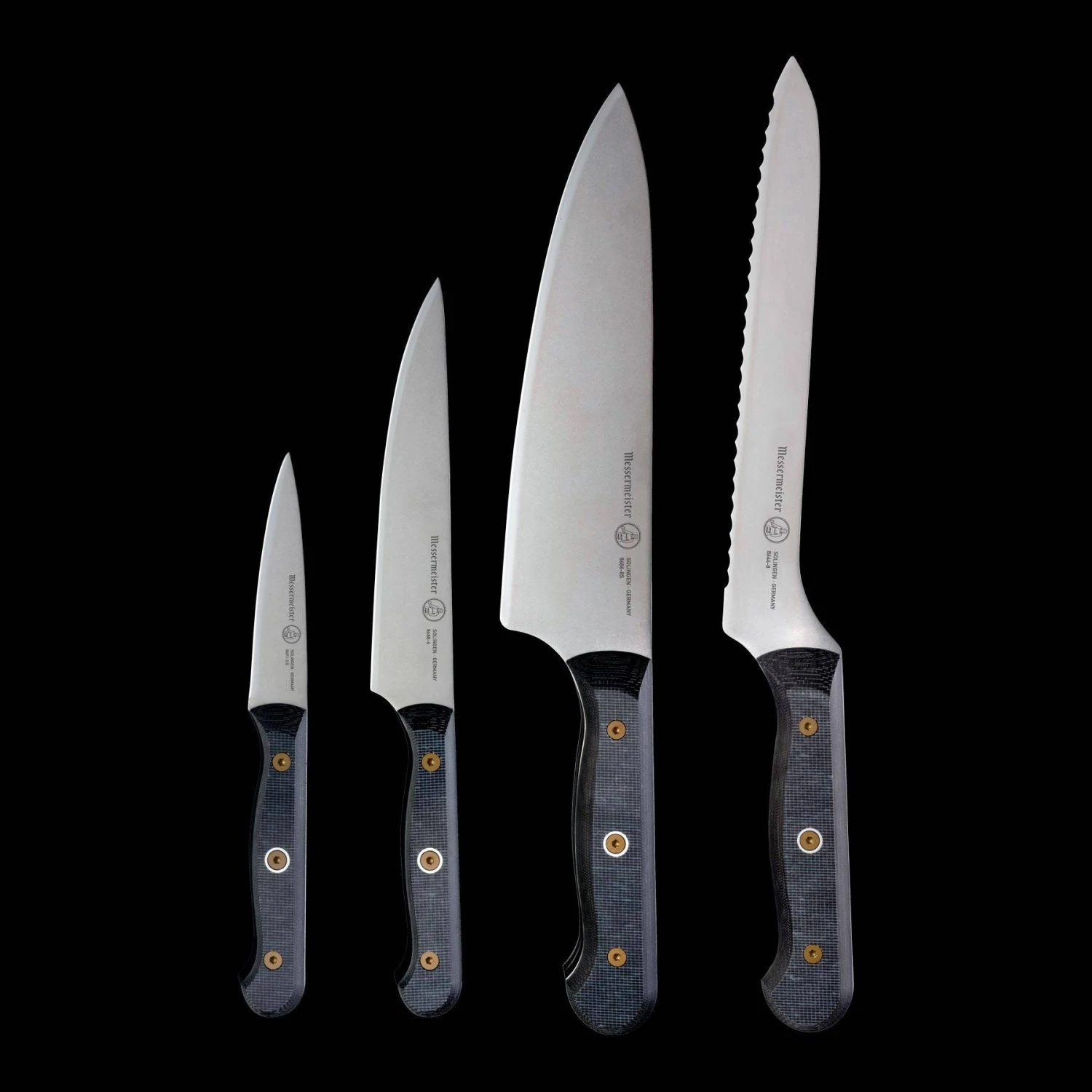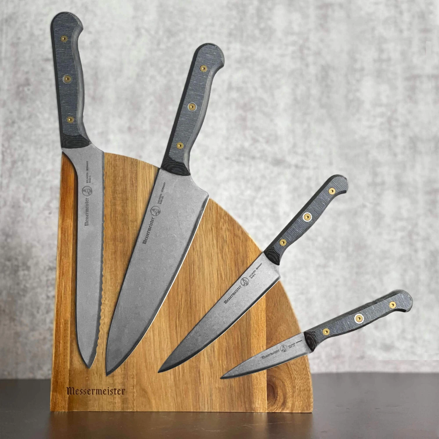 The Messermeister Custom 5 Piece Magnet Block Set consists of an 8″ Chef’s Knife , 8″ Scalloped Offset Knife, 6″ Utility Knife, 3.5″ Paring Knife, and an Acacia Magnet Block. This is an exquisite knife block set for any kitchen!