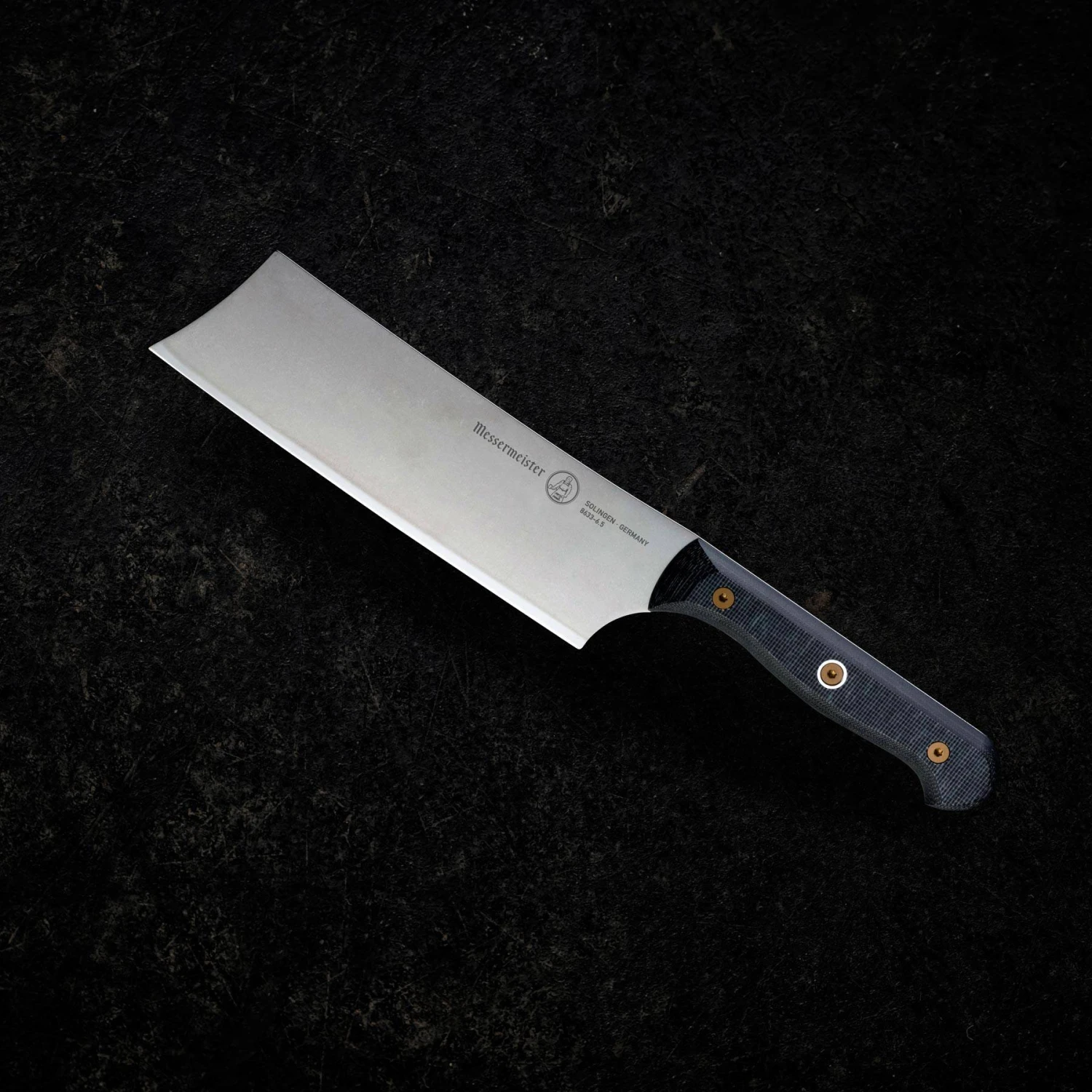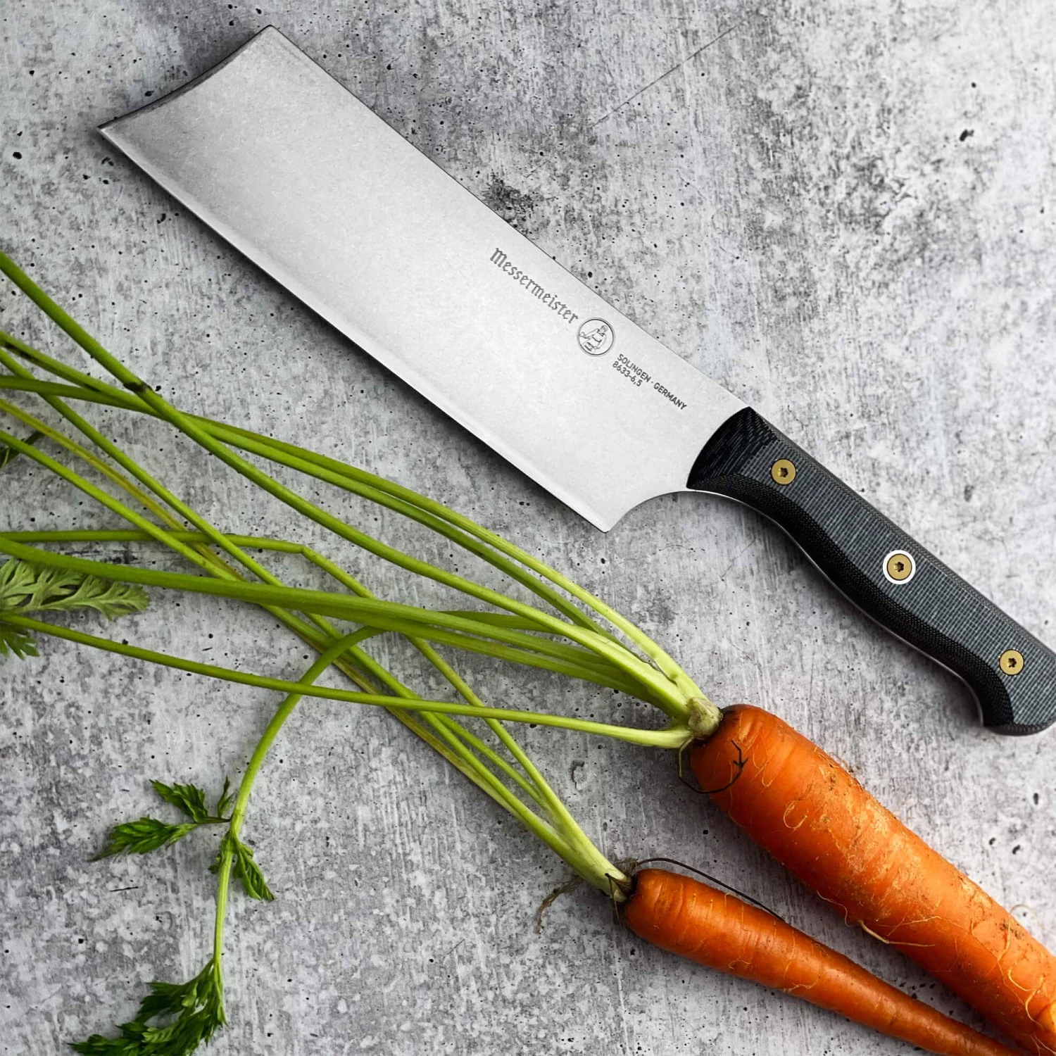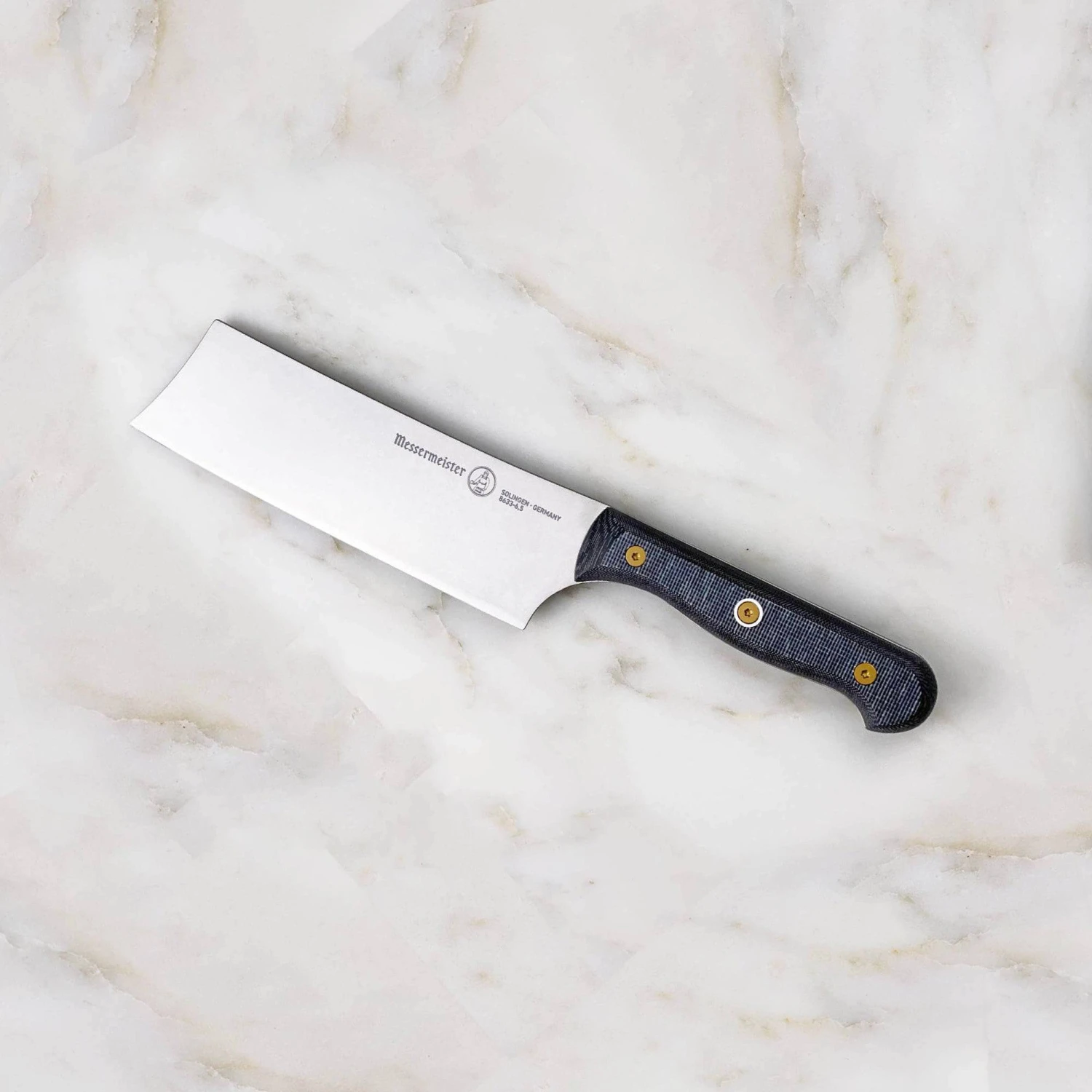 Our Messermeister Custom 6.5″ Nakiri is a traditional Asian inspired blade, which has gained popularity for it’s thin blade and easy-to-use straight cutting edge. We have given the traditional shape a twist by incorporating a „Spanish point” to improve the utility in the tip. The Nakiri is a great choice for blazing through mountains of vegetables. Our cambered handle design gives you maximum control and hand clearance, while the straight edge makes positive contact on the cutting board.