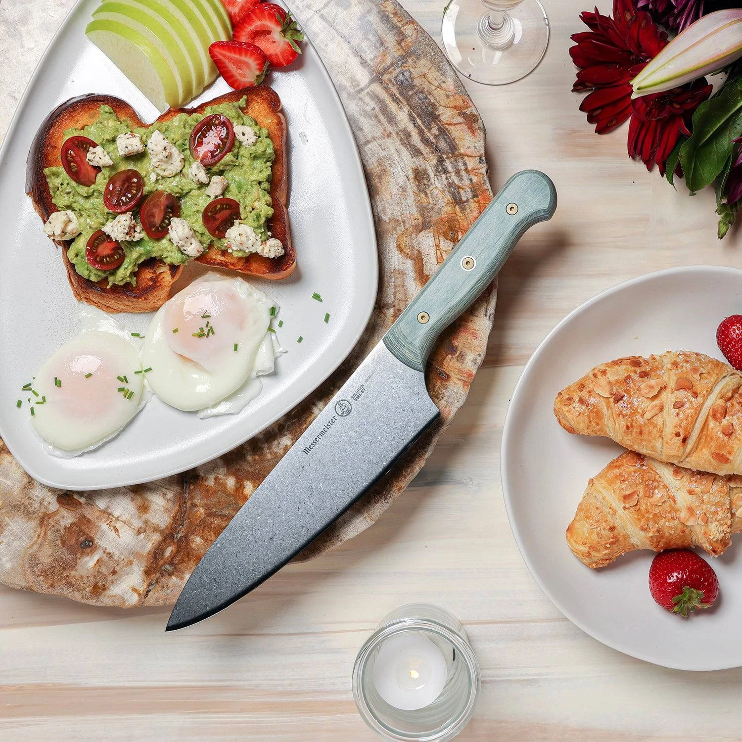 The Messermeister Custom Chef’s Knife is the workhorse in every kitchen. You’ll gravitate towards this knife and find yourself using it for most of your cutting tasks. The 2.2mm blade is engineered to be light, fast and agile with a full taper grind for featherweight performance without sacrificing strength. The center of mass is located on the leading edge of the handle for optimal balance. The raised tang has a 5-degree camber for maximum ergonomic comfort and control. We also pushed the heal of the knife forward to keep the sharp bits away from your fingers.