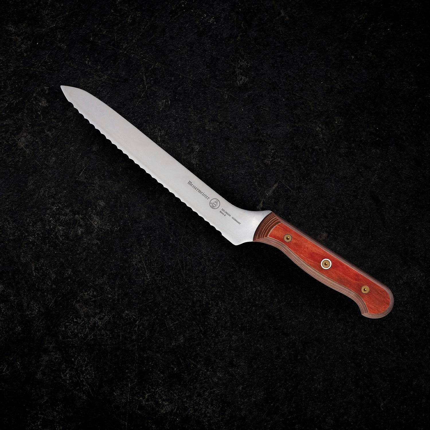 You will gravitate towards the Messermeister Custom 8 Inch Scalloped Offset Knife due to its unique versatility. Designed for pull-cuts, the long rigid blade produces a straight controlled slice with minimal sawing motion. Teeth ground into the edge keep the knife from skating across the surface, while sharp valleys between the teeth slice through your food. The offset feature of this knife provides maximum hand clearance and improved contact with the cutting surface. Use this knife for slicing bread, sandwiches, soft skinned fruits and vegetables.
