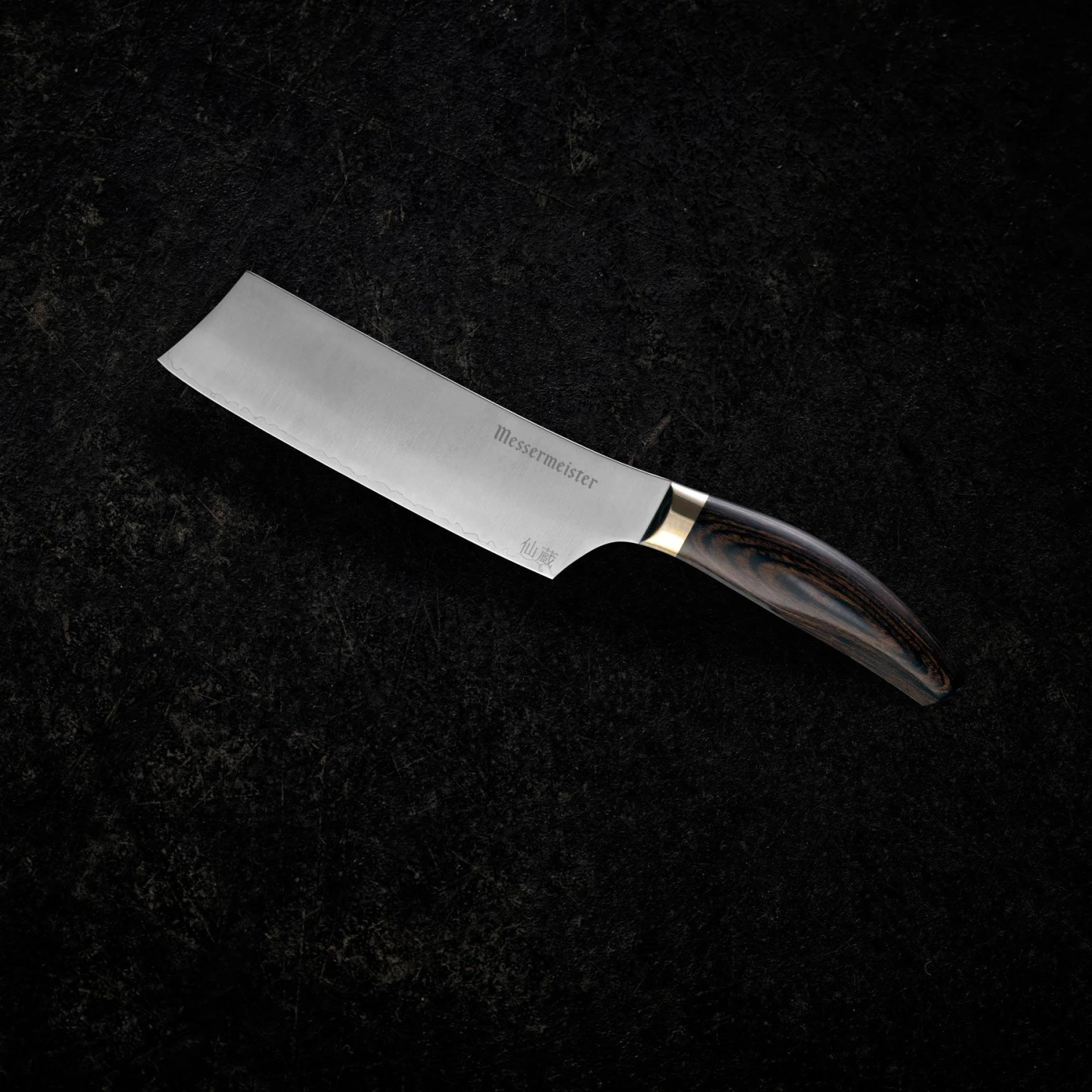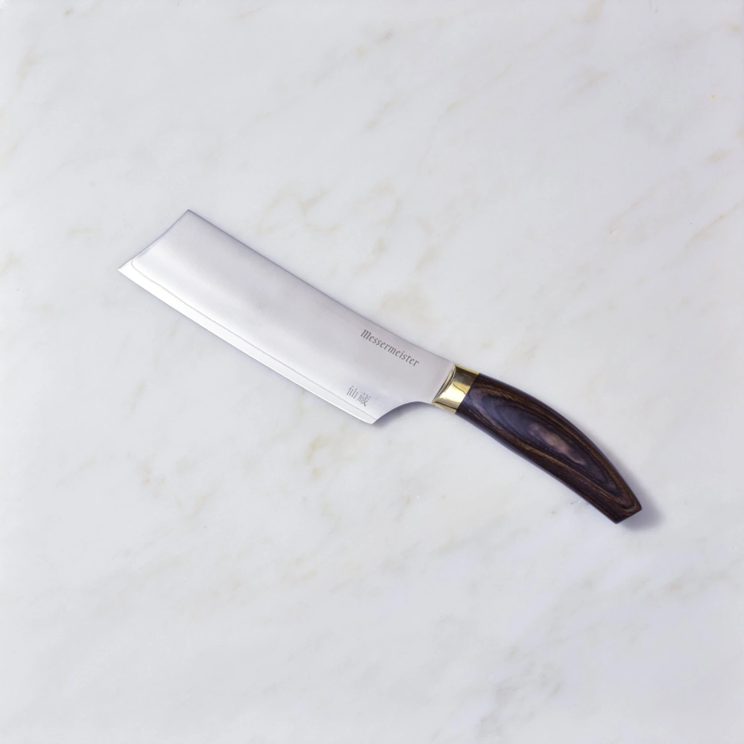 Our Messermeister Kawashima 6.5″ Nakiri is a traditional Asian inspired blade, which has gained popularity for it’s thin blade and easy-to-use straight cutting edge. We have given the traditional shape a twist by incorporating a „Spanish point” to improve the utility in the tip. The Nakiri is a great choice for blazing through mountains of vegetables. Our cambered handle design gives you maximum control and hand clearance, while the straight edge makes positive contact on the cutting board.