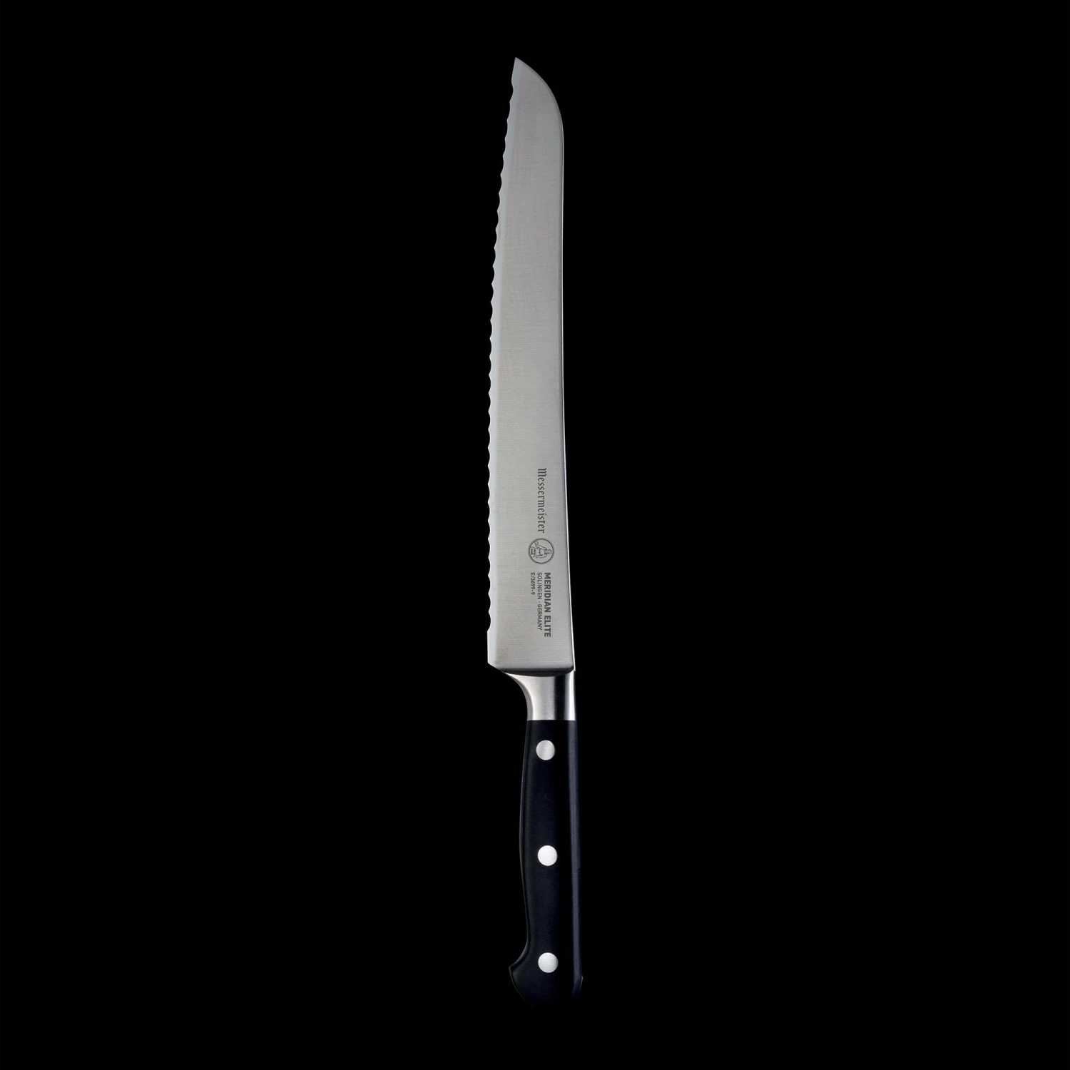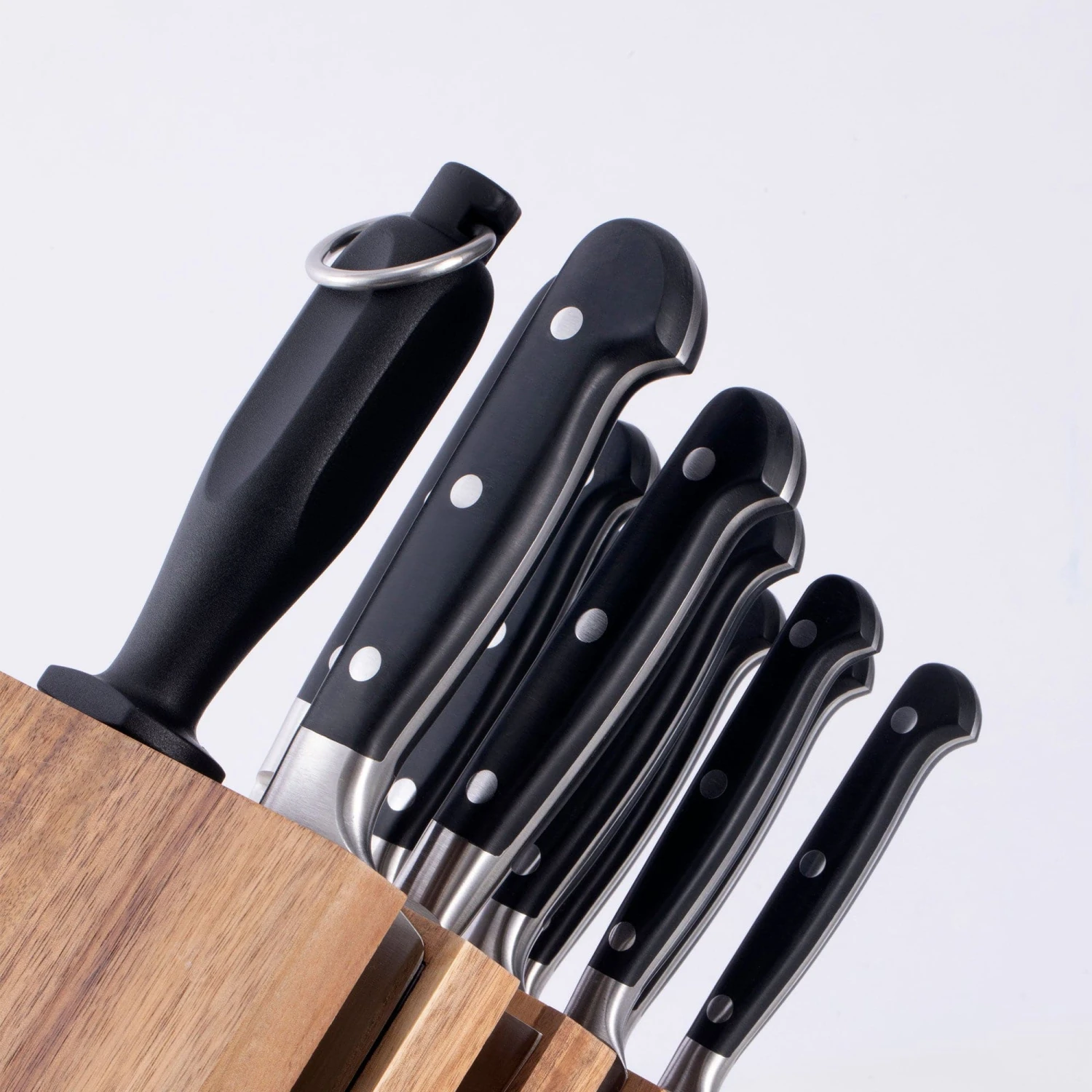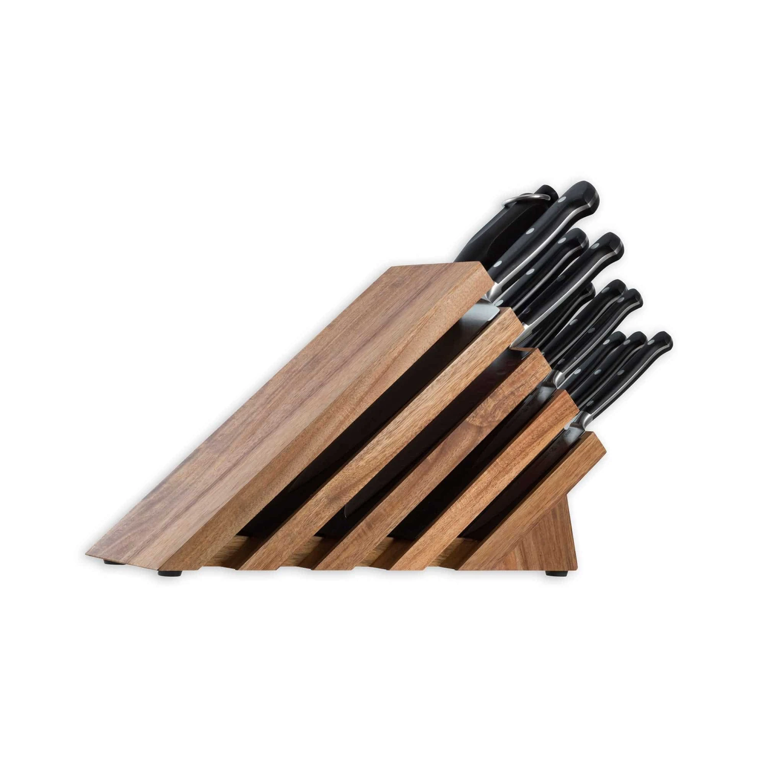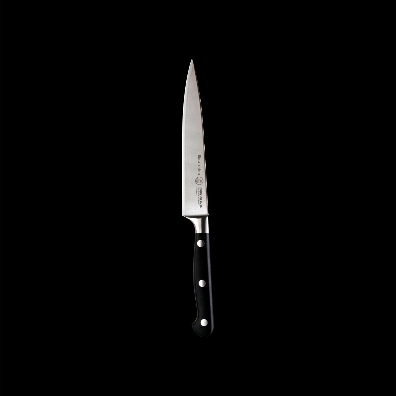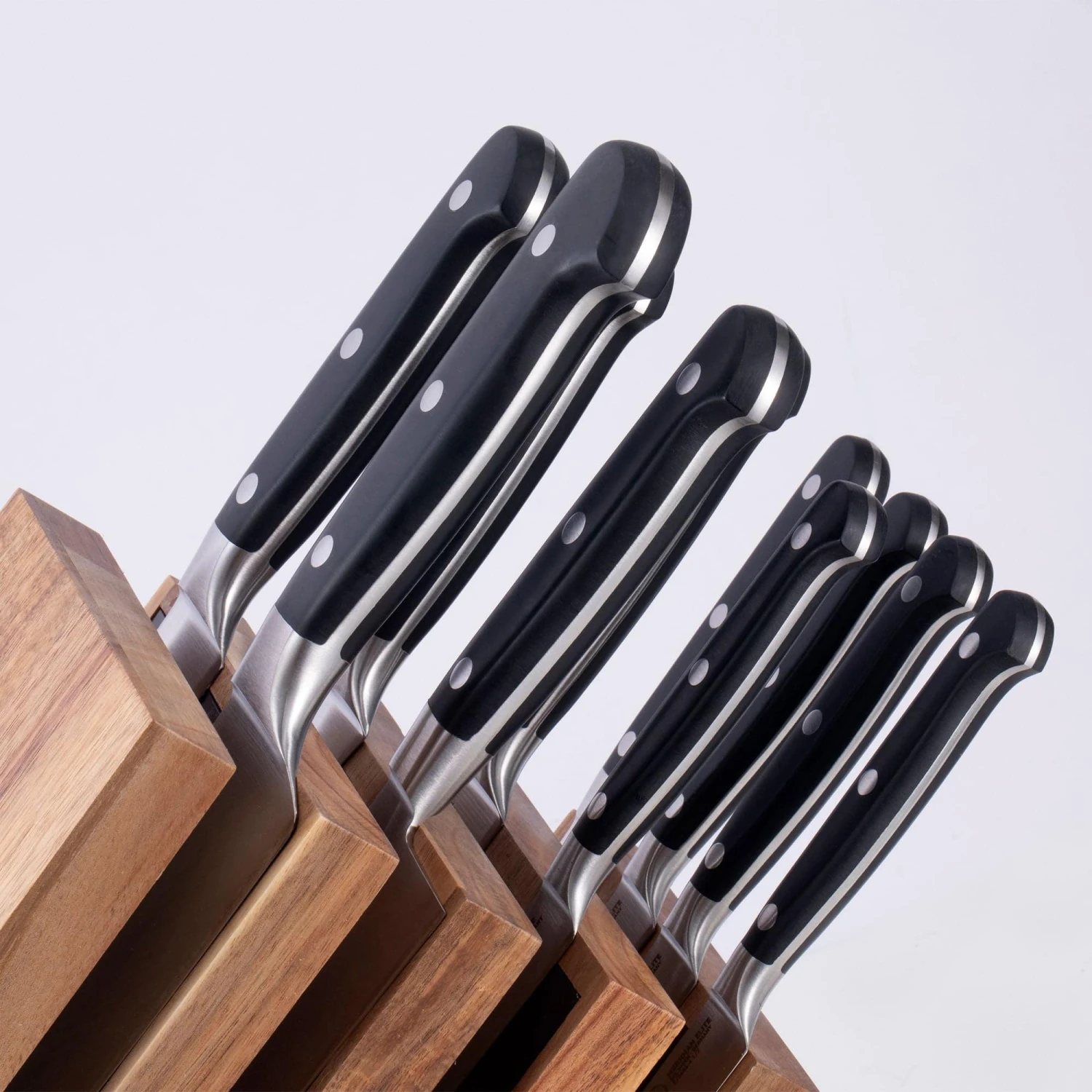 The Messermeister Meridian Elite 11 Piece Next Level Block Knife Set consists of an 8″ Stealth Chef’s Knife, 9″ Scalloped Bread Knife, 7″ Kullenschliff Santoku, 6″ Flexible Boning Knife, 6″ Utility Knife , 3.5″ Paring Knife, (4) 4.5″ Fine Edge Steak Knives, and a Next Level Block. This is an exquisite knife block set for any kitchen!