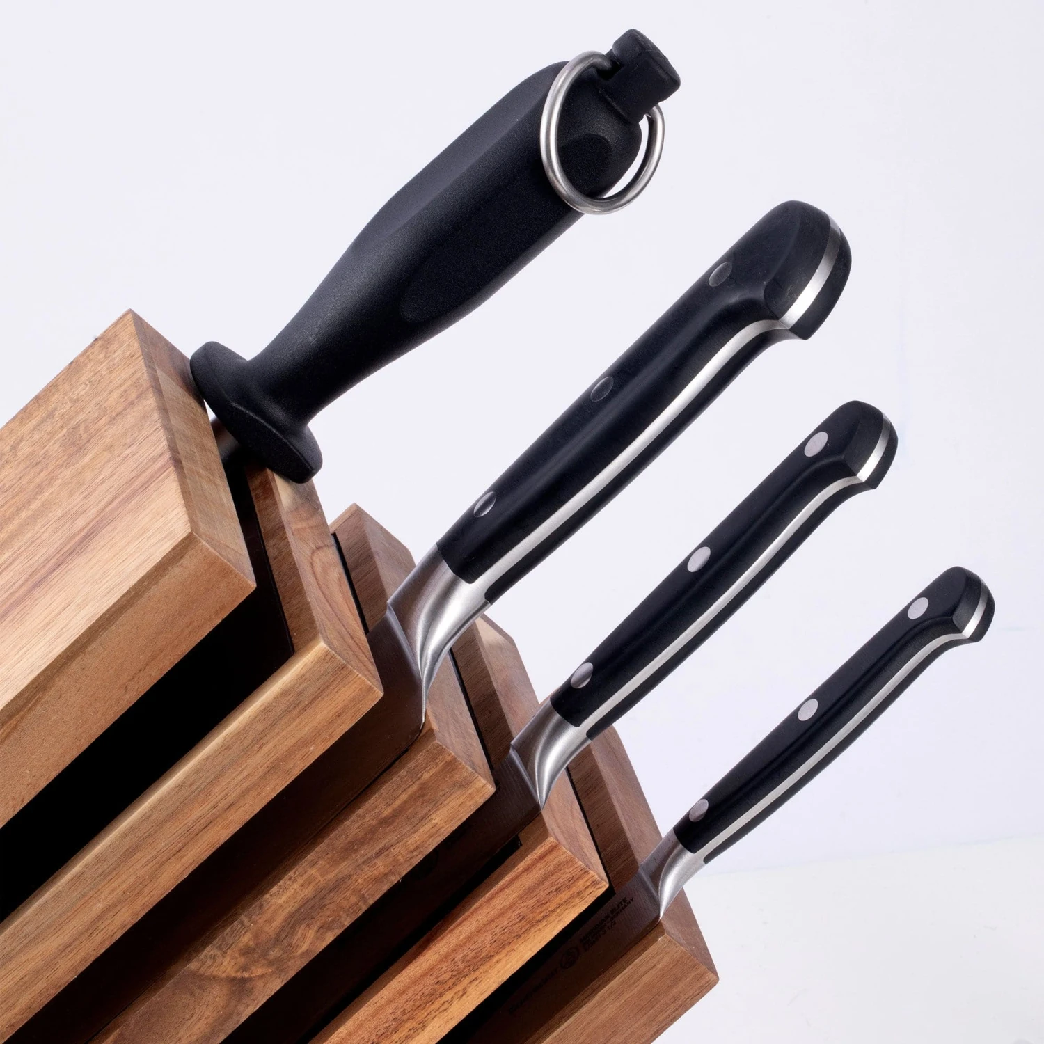 The Messermeister Meridian Elite 5 Piece Next Level Block Knife Set consists of an 8″ Stealth Chef’s Knife, 6″ Utility Knife , 3.5″ Paring Knife, 10″ Fine Steel, and a Next Level Block. This is an exquisite knife block set for any kitchen!