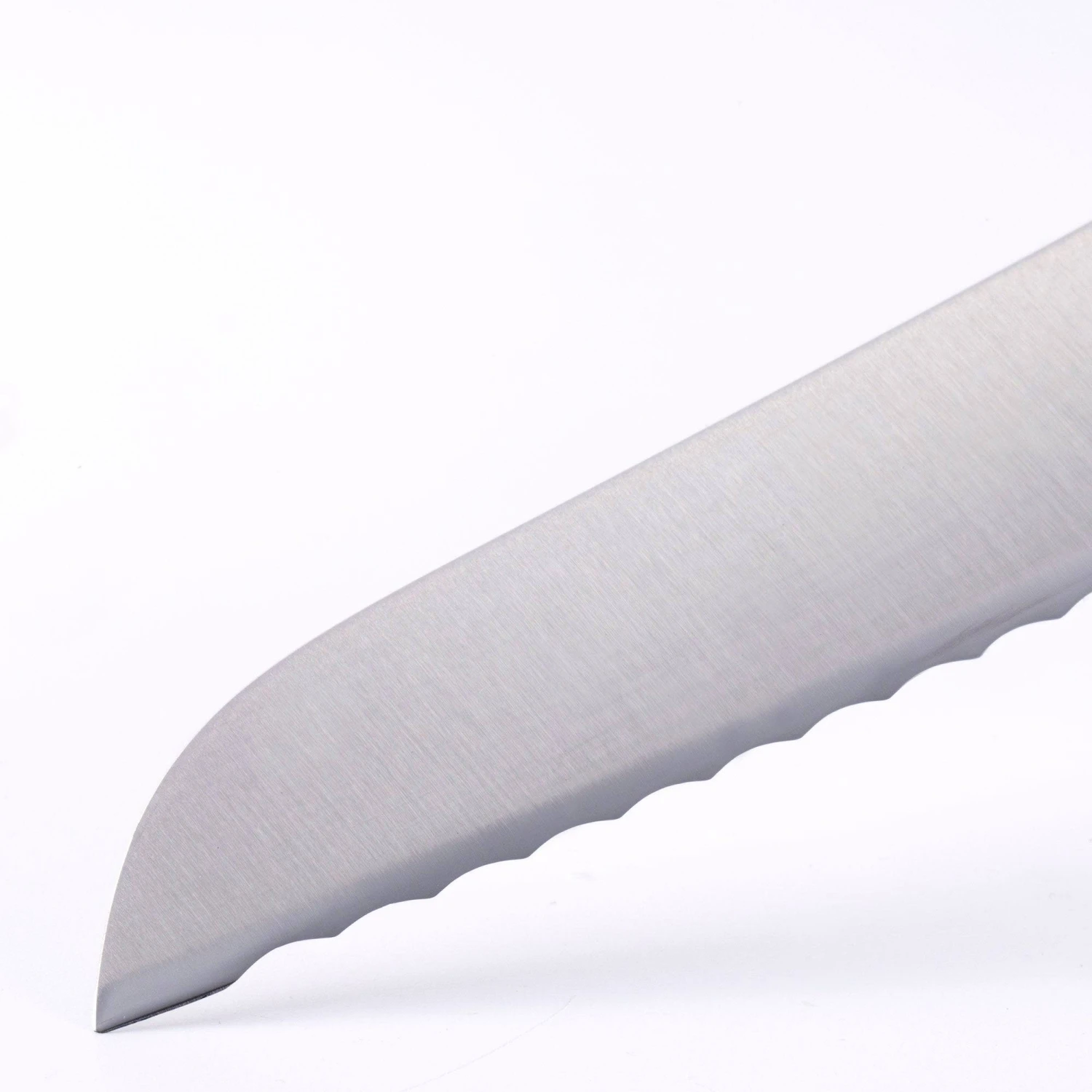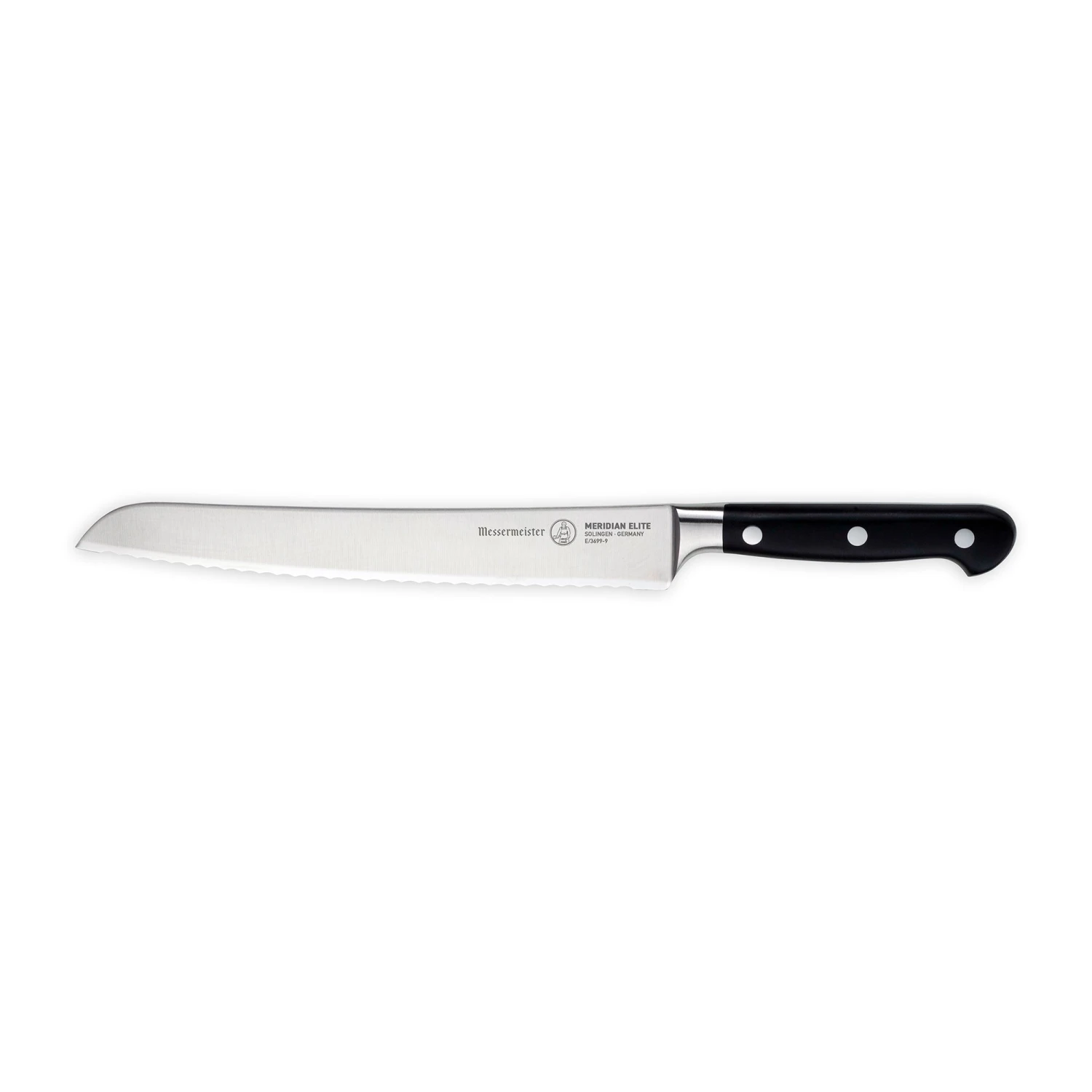 The scalloped edge of the Messermeister Meridian Elite 9” Bread Knife will bite into the crust of bread with certainty. The serrations on this knife produce smooth, clean cuts with fewer crumbs and minimal compression. This knife slices flawlessly through soft-skinned fruits and vegetables as well, however it is not recommended for cutting proteins.