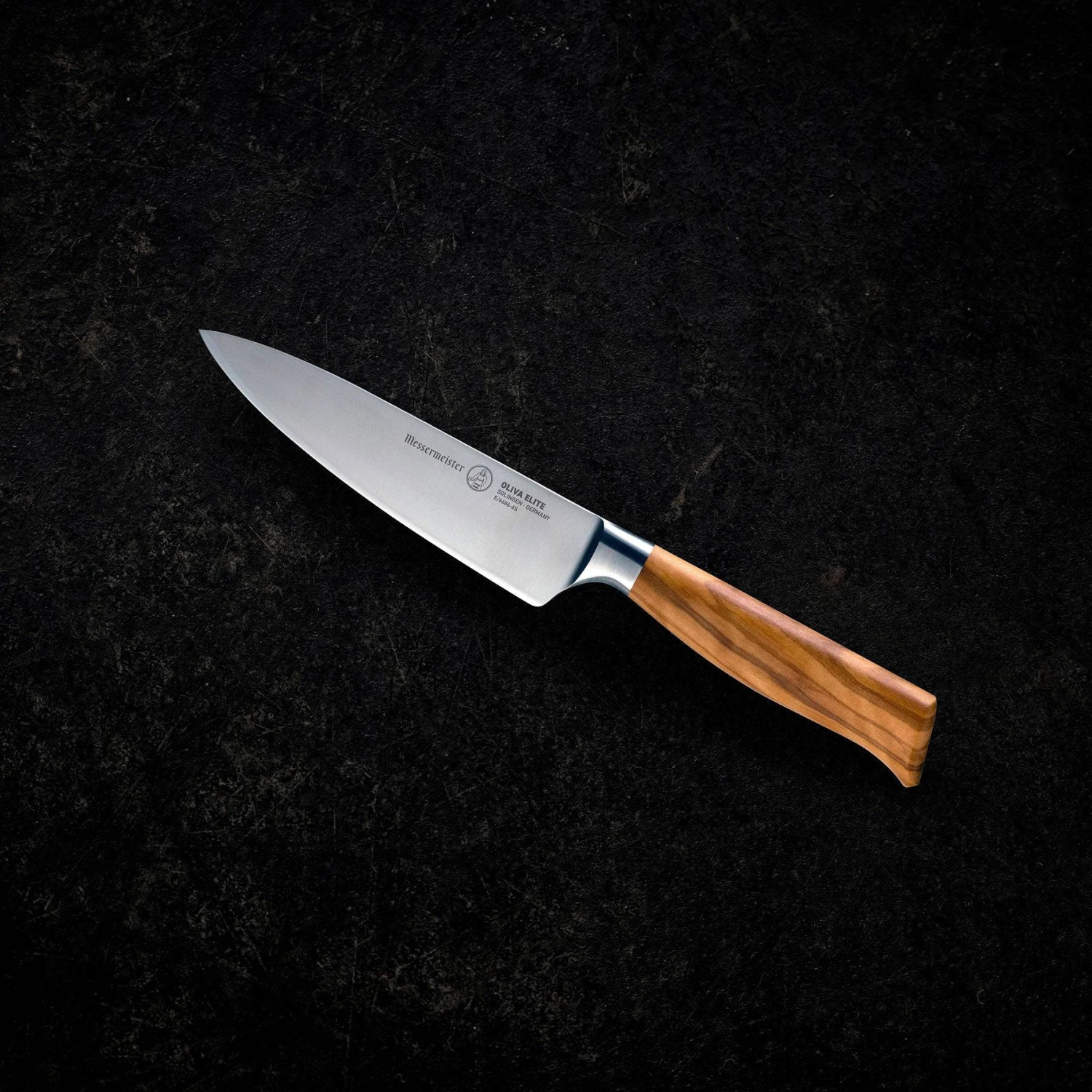 The Messermeister Oliva Elite 6″ Chef’s Knife is the workhorse of all the knives. You will gravitate towards it when executing 90% of your culinary tasks. It has a highly figured Italian olive wood handle attached to a hand forged Stealth blade and is about 25% thinner and 10% lighter than our traditional chef’s knife. It has been ground down to a thin profile to create a razor sharp edge. With this knife, you can chop, slice, dice and mince your way through extended cutting tasks without fatigue.