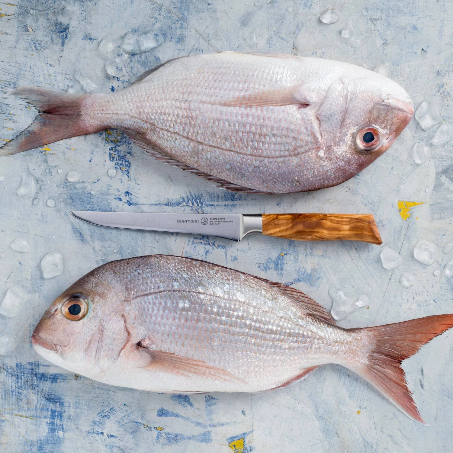 The Messermeister Oliva Elite 6” Flexible Boning Knife is an essential knife for butchers designed to remove bones from meat, poultry and game. It comes in flexible or stiff and the tapered, pointed blade provides excellent control and precision for cutting tasks that render maximum yield. The German stainless steel blade guarantees razor like sharpness and longevity. This striking boning knife exudes the perfect combination of performance and style complete with a highly figured, golden olive wood handle.