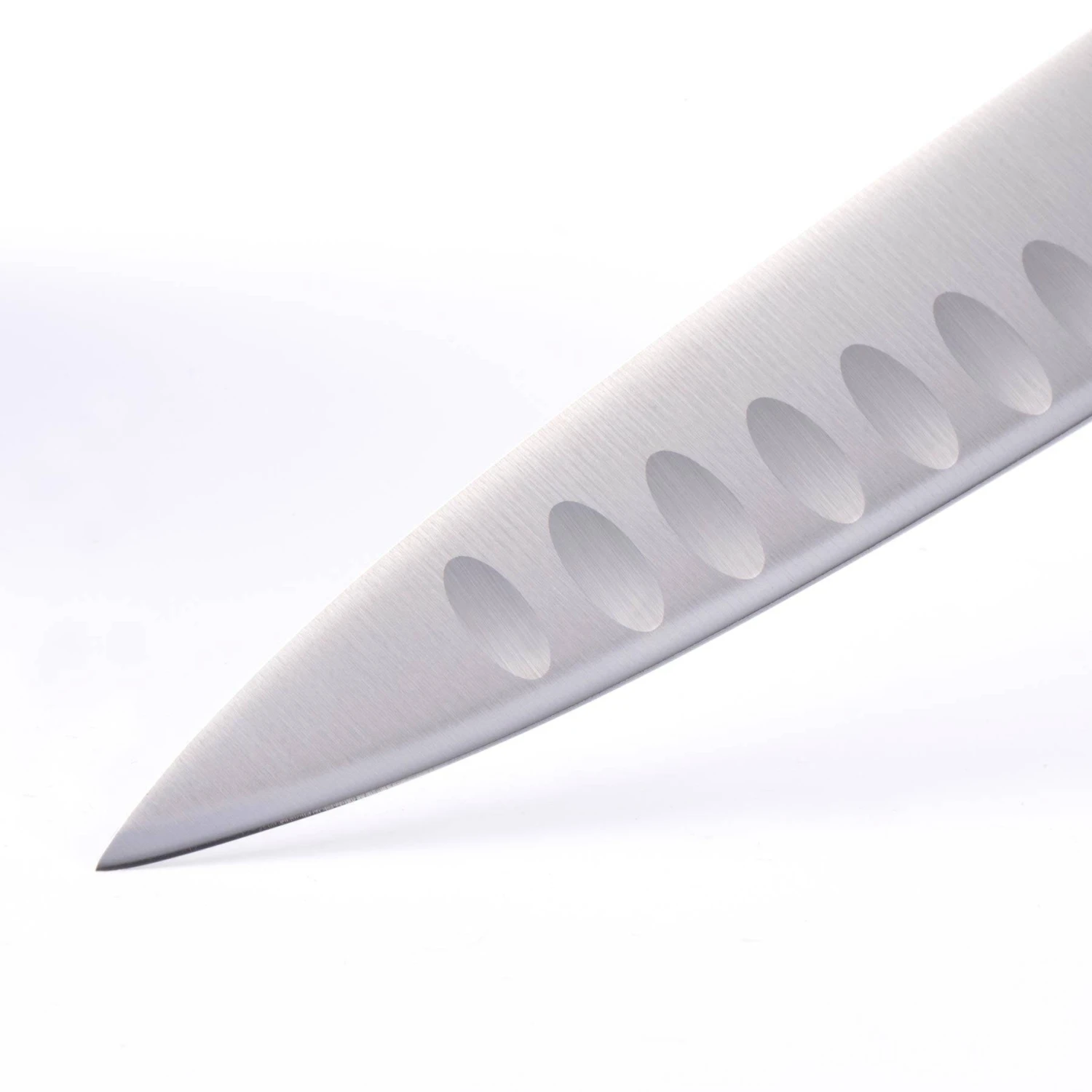 Handcrafted by 4th generation knife artisans in the historical cutlery city of Solingen, Germany, the Messermeister Oliva Elite 8″ Carving Knife has a narrow spear-point, fine-edge blade that is used for small to medium carving chores. It separates meat from the bone and slices it into thin serving portions. The alternating kullenschliffs (a.k.a. kullens, hollows or grantons) on each side of the knife reduce drag and prevent items from sticking to the blade. Pair this with the Oliva Elité Carving Fork.