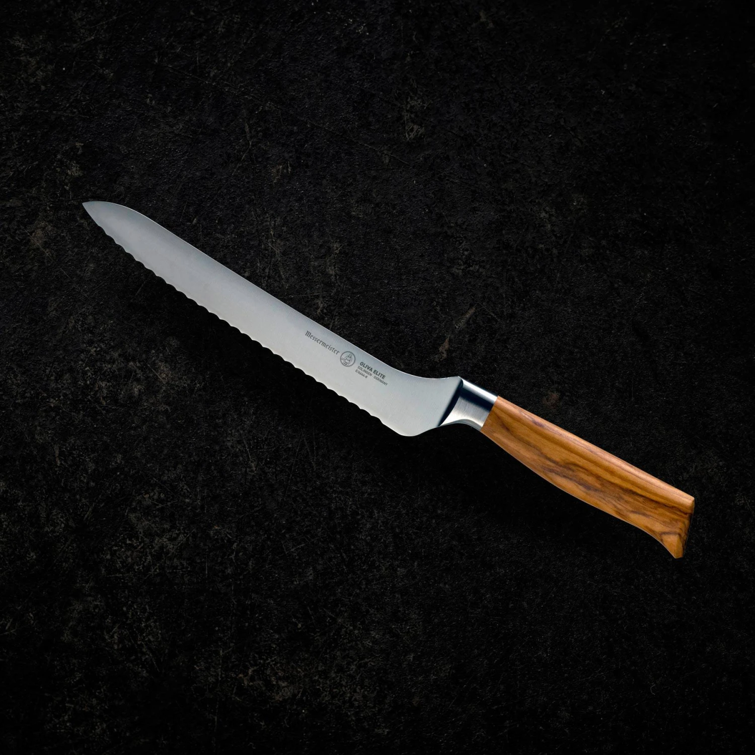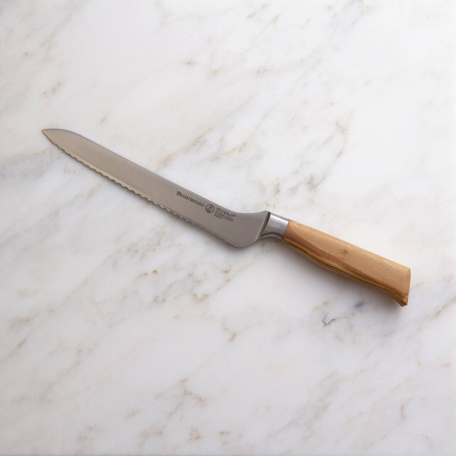 The Messermeister Oliva Elite 8″ Scalloped Offset Knife is extremely versatile. The offset feature of this knife provides maximum grip clearance between hand and cutting surface while providing optimal leverage and keeping knuckles out of harm’s way. The scalloped blade cuts easily through crisp bread crusts without compressing the delicate interiors.