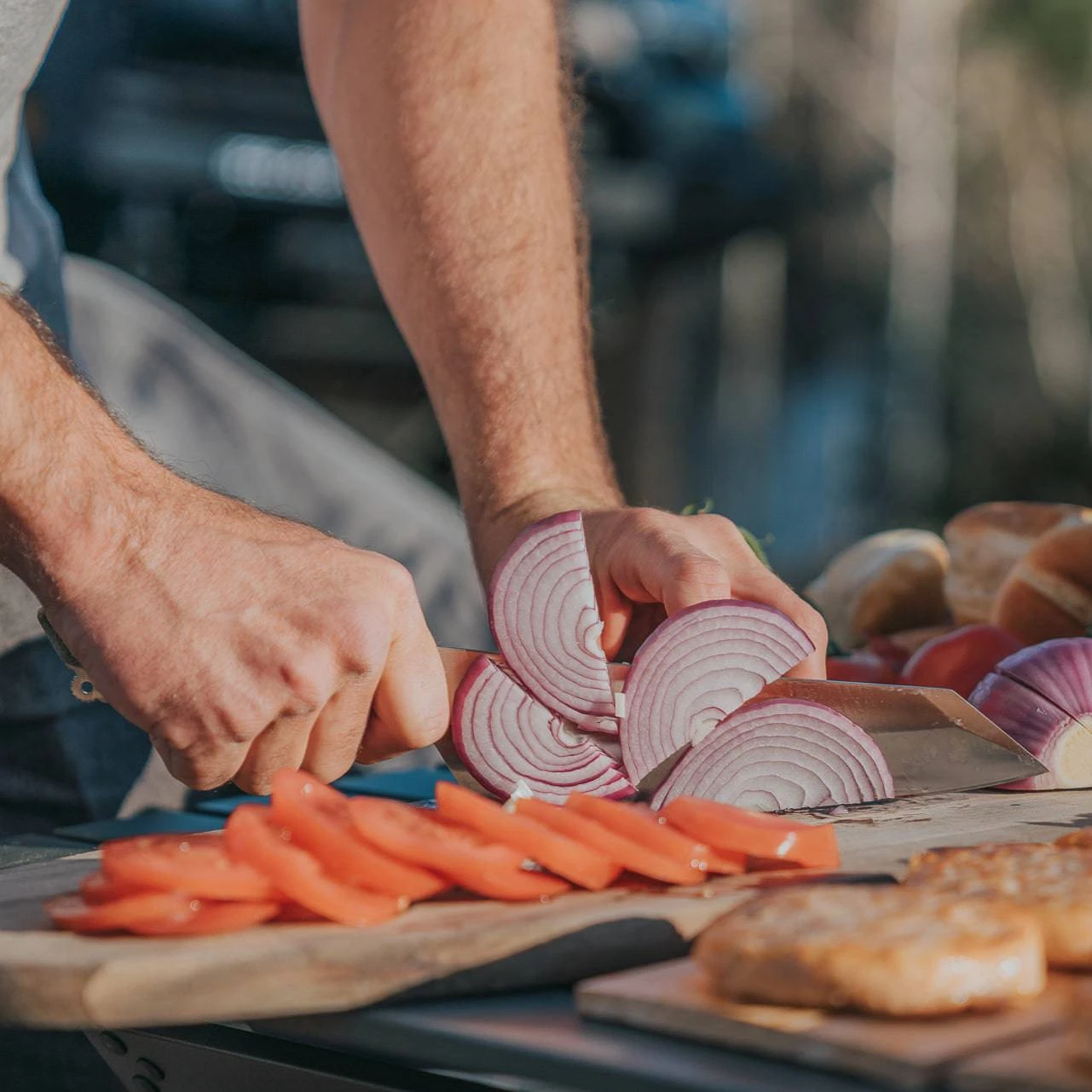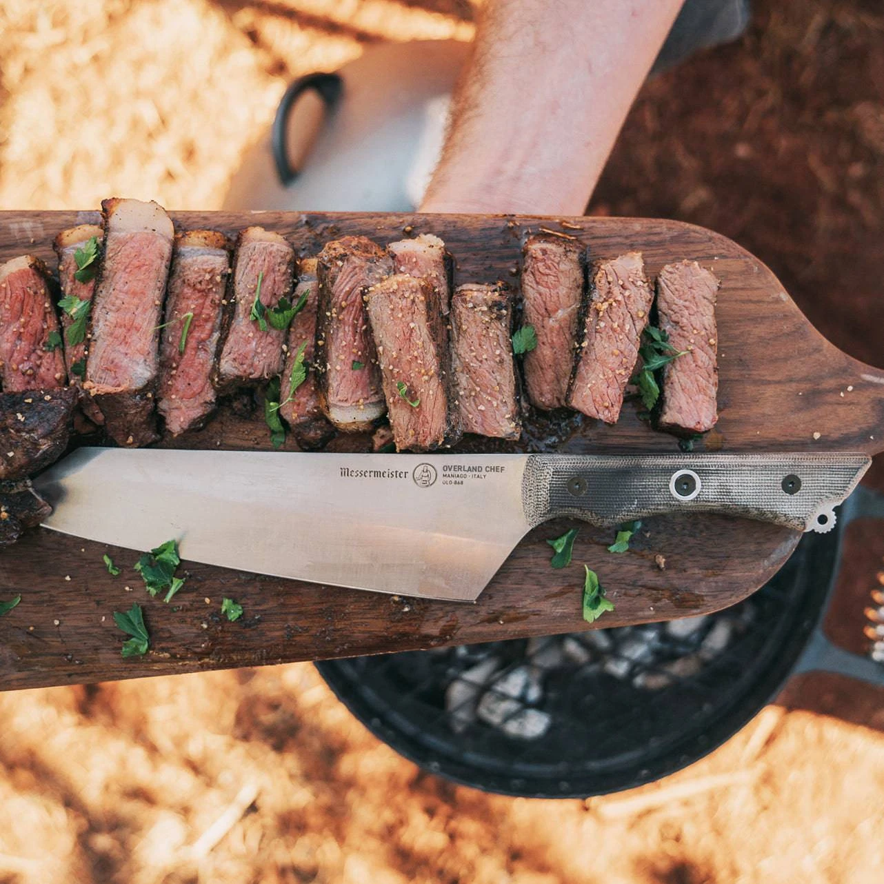Cooking outdoors requires serious tools. We built our Overland Chef 8″ Chef’s Knife to be rugged and versatile. The ultra-tough canvas Micarta handle has a contoured pommel and machined lanyard eyelet for a sure, comfortable grip with any sized task around the campsite. Our 60/40 blade grind moves additional weight over the cutting edged the ballistic clip point adds strength to the tip. Despite the extra heft, the Overland Chef’s Knife is surprisingly responsive and lively when used on a cutting board. Staying sharp is key, so we used nitro cobalt steel which will hold a terrific edge that is easy to restore.