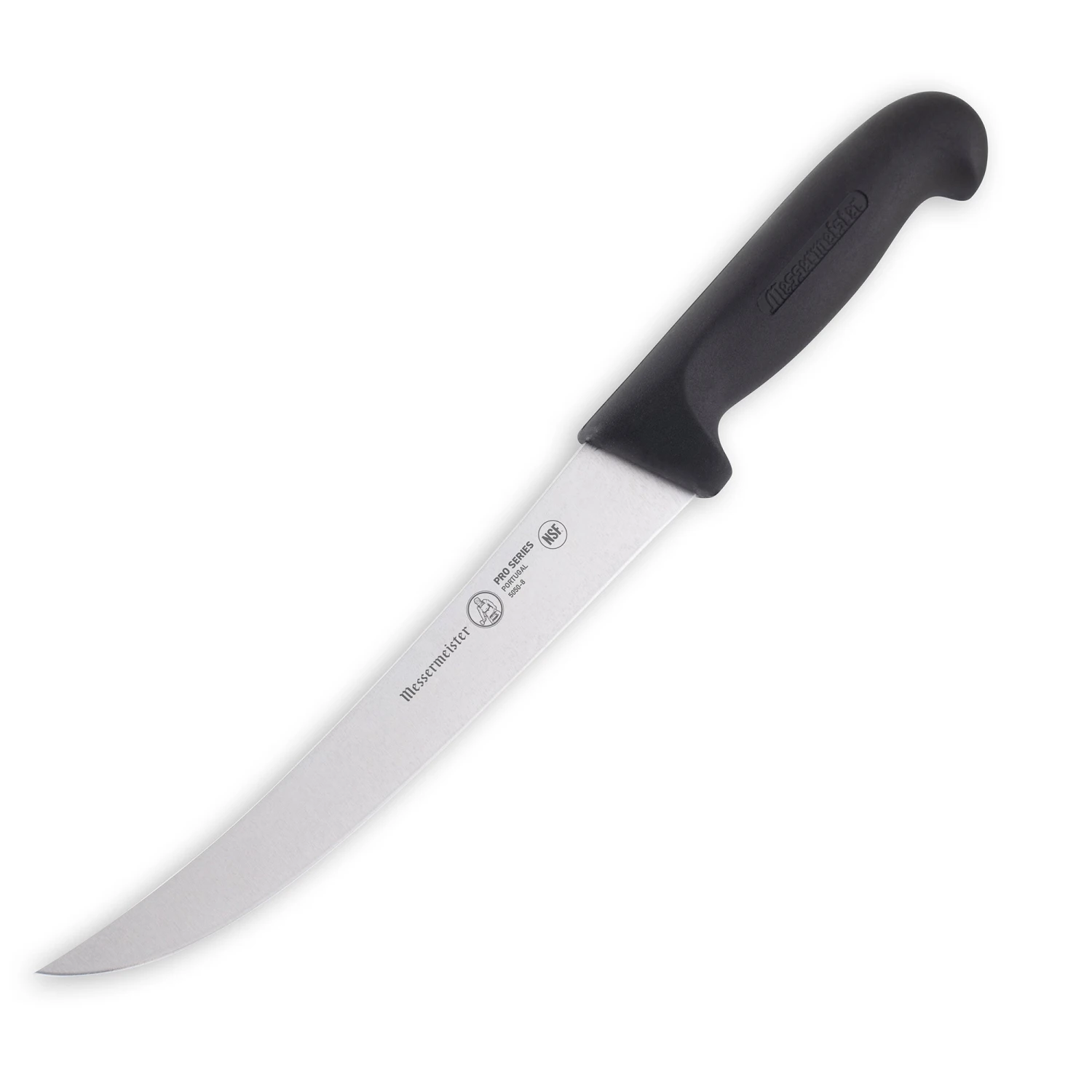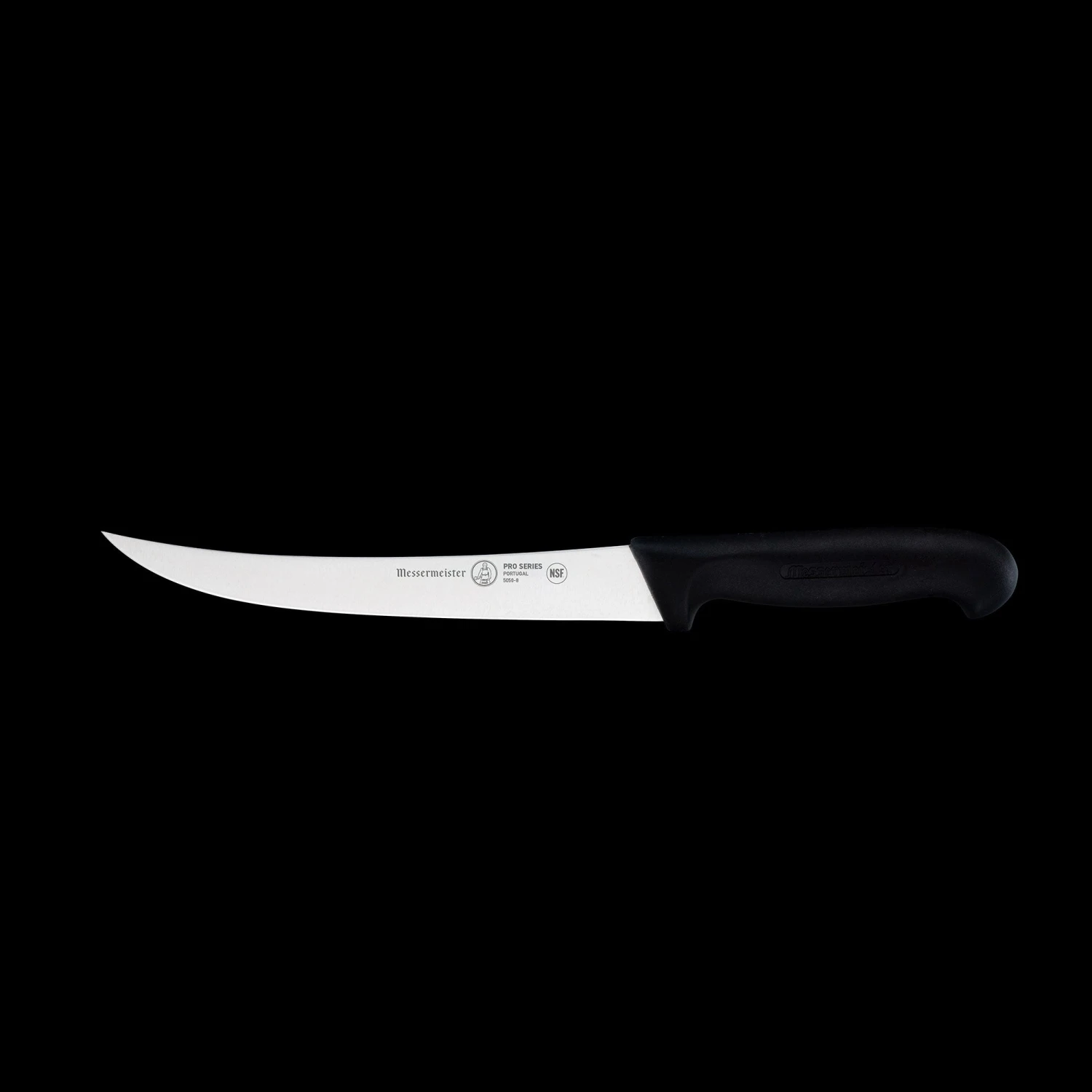 The Messermeister Pro Series Breaking Knife is used to break down large quarters of beef, pork or lamb into smaller roasts and pieces. This knife is an excellent choice for most butchering work. This long stamped blade curves upward to a pointed tip and is attached to a non-slip handle. Preferred by culinary professionals and butchers, this knife is designed to ‘break’ through skin, cartilage and small bones. The razor sharp blade trims through fat and easily portions out larger cuts into individual portions.
