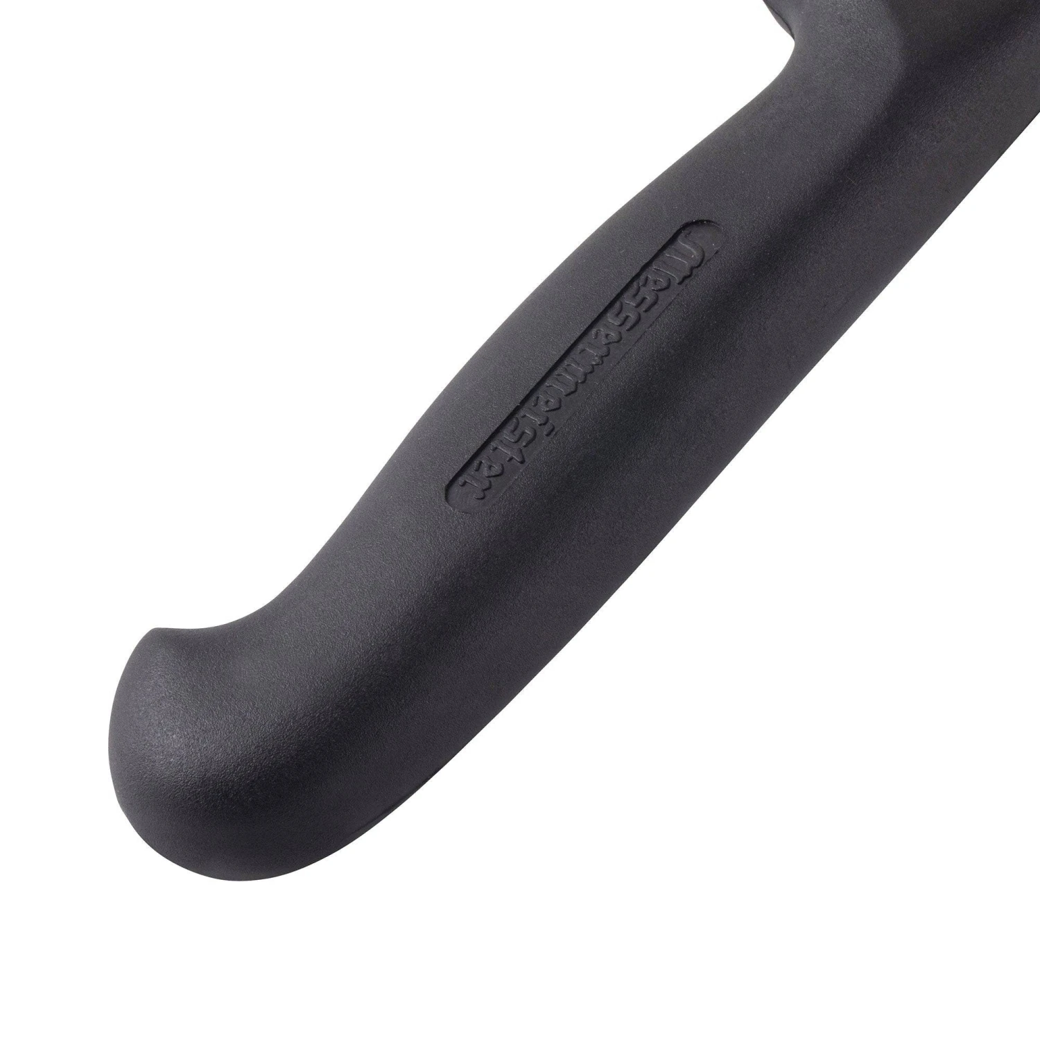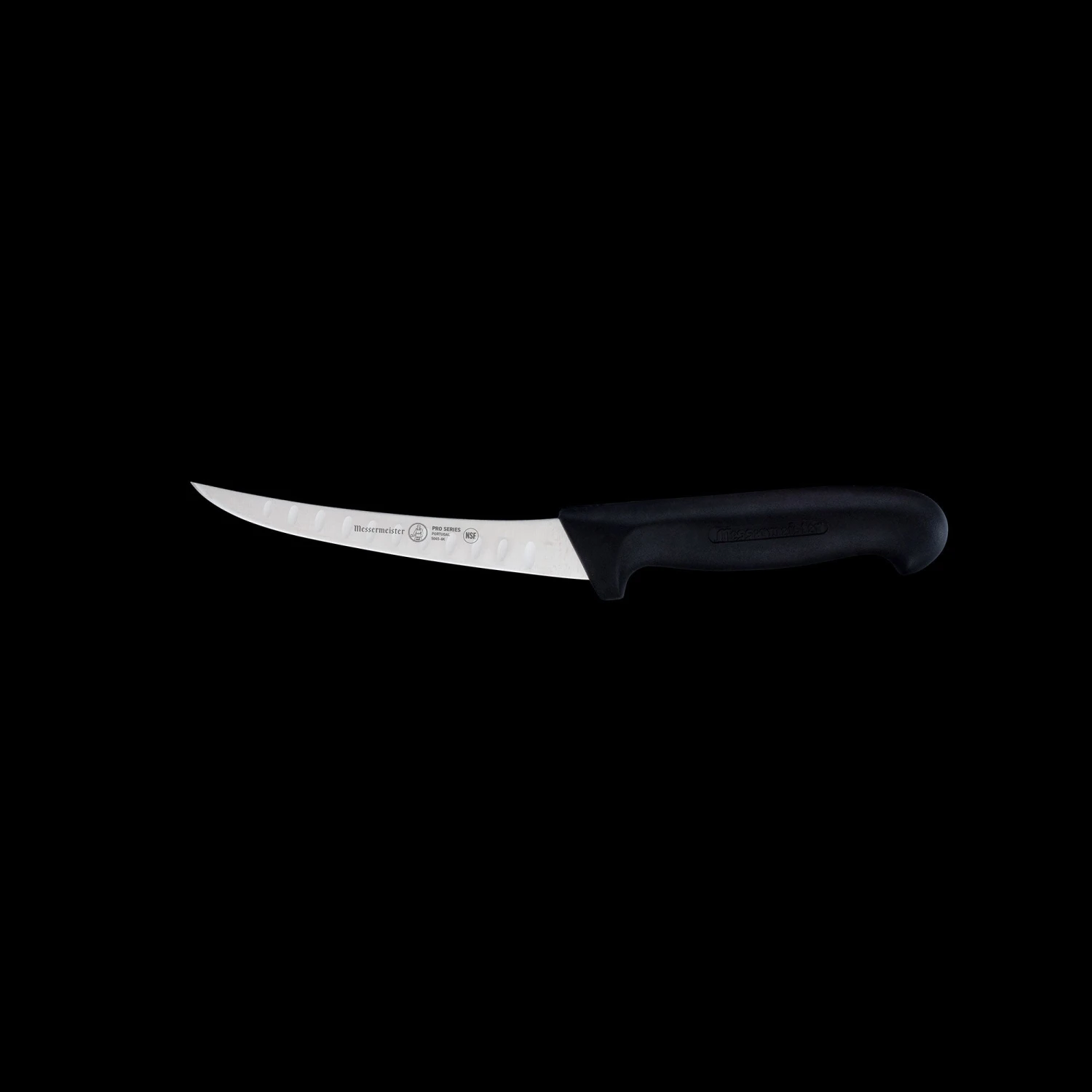 The Messermeister Pro Series 6″ Semi-Flexible Curved Kullenschliff Boning Knife has a stamped, narrow, semi-flexible blade with an upward curve. Preferred by culinary professionals, this commercial quality knife is used to trim cuts of meat, separate meat or fish from the bone or separate flesh from the curved skin of a melon. The alternating kullenschliffs (a.k.a. kullens, hollows or grantons) on each side of the knife reduce drag and prevent items from sticking to the blade.