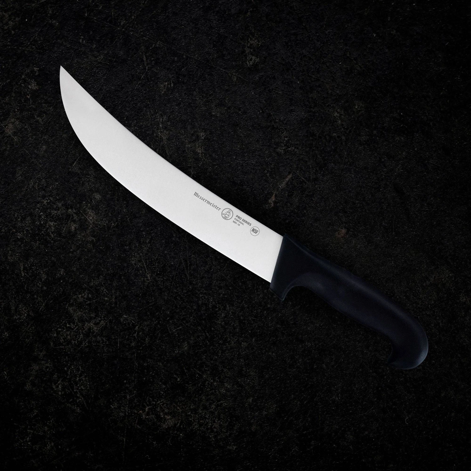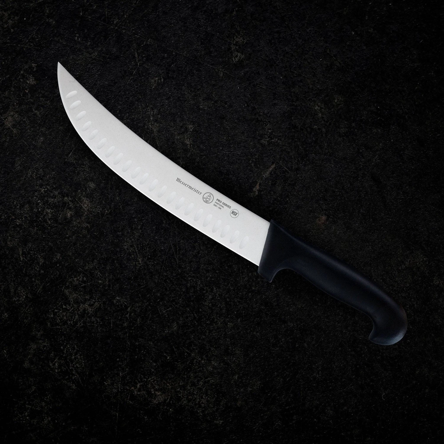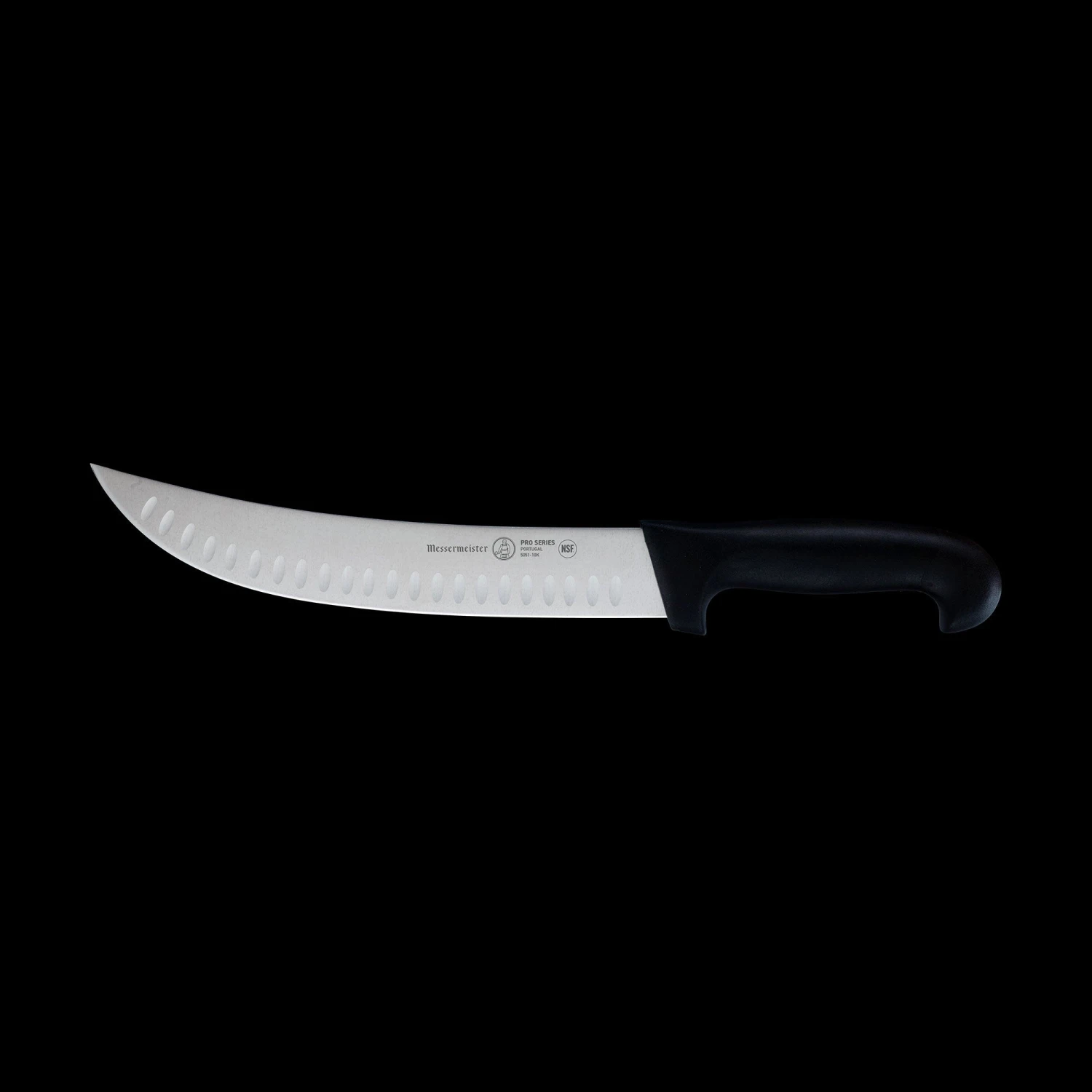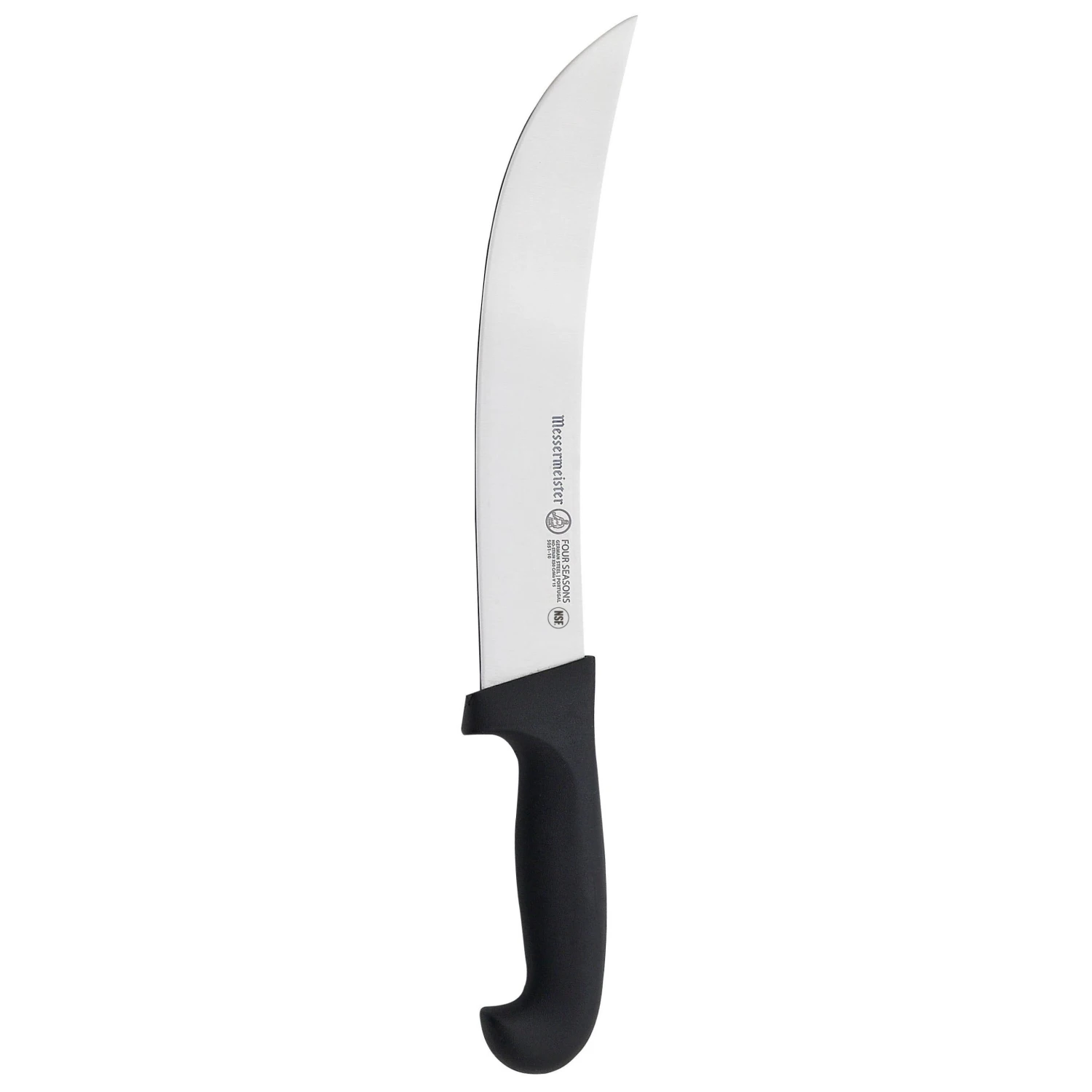 The Messermeister Pro Series 10” Scimitar Knife features a rigid stamped blade with an upward curve and ample girth, wider than a breaking knife blade. This large butcher’s knife is attached to a non-slip handle, this allows you to slice with one swift motion and eliminates sawing back-and-forth. The Kullens Scimitar has alternating kullenschliffs (a.k.a. kullens, hollows or grantons) on each side of the knife reduce drag and prevent items from sticking to the blade. Preferred by culinary professionals, butchers, and deep-sea fishing enthusiasts, this knife is designed to cut large pieces of meat into retail cuts such as steaks. It will cut through skin, cartilage, and small bones.