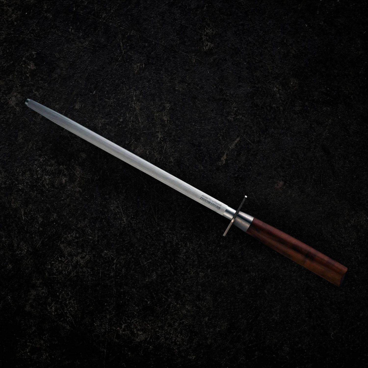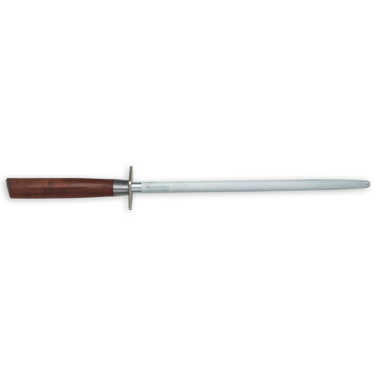 Keep your blades in tip-top condition by maintaining a razor-sharp edge with the Messermeister Royale Elite 10″ Fine Grit Steel. This German-made version is crafted from stainless steel attached to a highly figured American walnut burl handle. The fine grit steel works great on both Messermeister Elite and Japanese knife lines by restoring the knife’s edge, smoothing and re-aligning it to maintain an enduring sharpness. We do not recommend using this steel on serrated or scalloped blades.